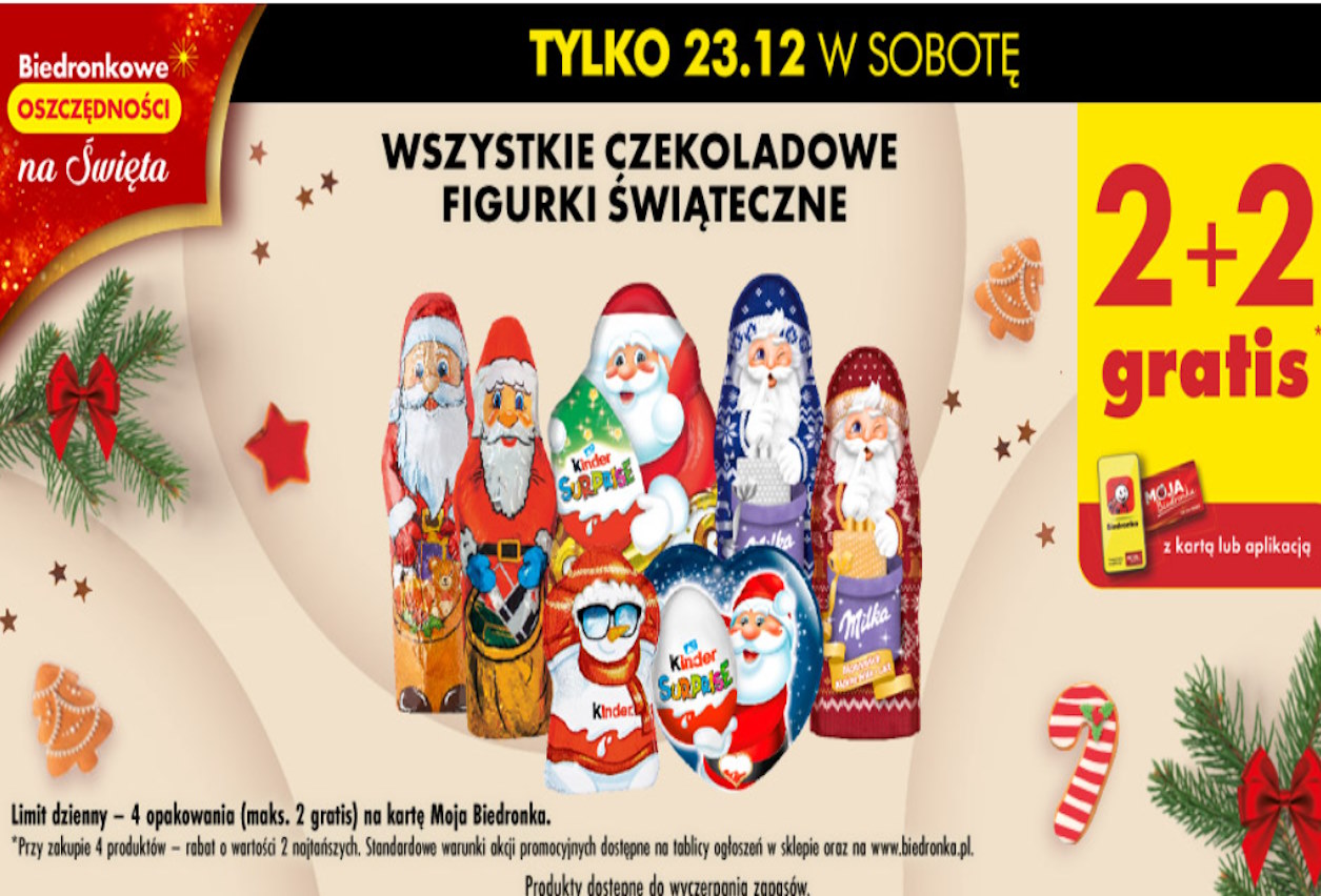 W nadchodzącą sobotę, 23 grudnia, sieć sklepów Biedronka przygotowała dla swoich klientów wyjątkową świąteczną promocję. W tym dniu wszyscy posiadacze karty lojalnościowej „Moja Biedronka” lub użytkownicy aplikacji będą mogli skorzystać z atrakcyjnej oferty: przy zakupie dwóch czekoladowych figurek świątecznych, dwa kolejne otrzymają gratis!