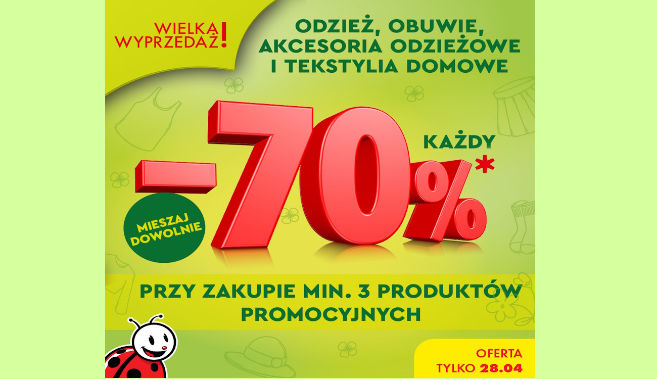Uwaga wszyscy łowcy okazji! Sieć sklepów Biedronka przygotowała dla swoich klientów wyjątkową niespodziankę z okazji niedzieli handlowej. Tylko teraz, przy zakupie minimum 3 produktów promocyjnych z kartą Moja Biedronka lub aplikacją, ceny odzieży, obuwia, akcesoriów odzieżowych i tekstyliów domowych spadają aż o 70%!