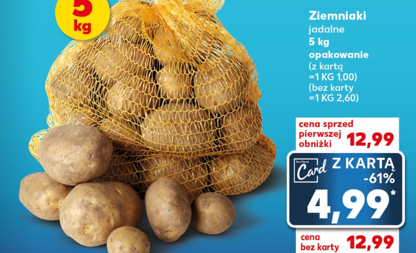Pięciokilogramowe opakowanie ziemniaków, które idealnie sprawdzi się na zimowe obiady, można nabyć za jedyne 4,99 zł przy użyciu Kaufland Card. Daje to niesamowicie niską cenę 1 zł za kilogram, co stanowi obniżkę aż o 61% w porównaniu do standardowej ceny bez karty wynoszącej 12,99 zł za pakiet. Bez karty lojalnościowej, cena za kilogram wynosi 2,60 zł, co nadal jest konkurencyjną ofertą na rynku.