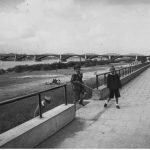 - Plaża i pływalnia w okolicy mostu Kierbedzia. Na horyzoncie Most Średnicowy. Zdjęcie wykonano pomiędzy 1931, a 1939 rokiem.