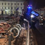 Nietypowa kolizja. Samochód staranował słupki i rowery miejskie po czym zawisł na barierach