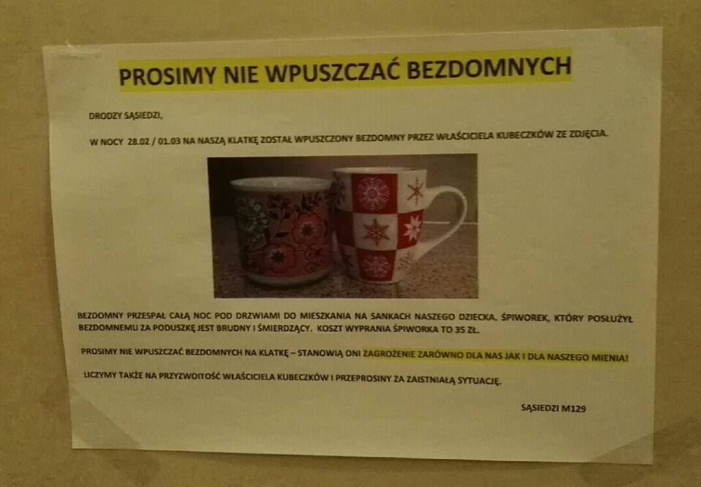 Na klatce schodowej jednego z bloków na Kabatach, ktoś umieścił prośbę, by nie wpuszczać bezdomnych. To, że obcych nie wpuszcza się na klatkę schodową jest rzeczą dla większości jasną. Sytuacja jednak przestaje być już tak oczywista, gdy weźmiemy pod uwagę datę wydarzenia. Było to w czasie największych mrozów, gdy noclegownie były przepełnione.