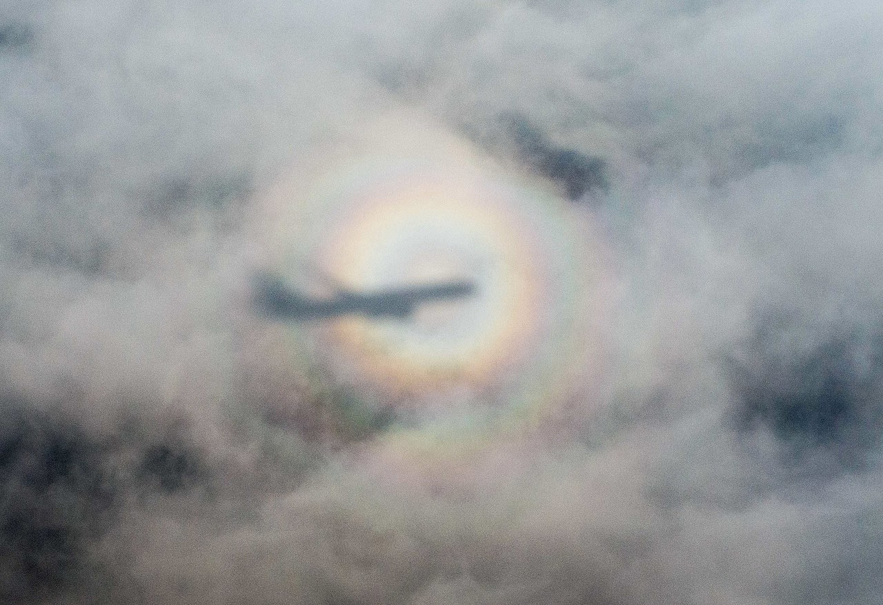 Podczas lądowania, samolot przelatywał przez warstwę chmur, gdy nasza reporterka zauważyła cień samolotu na chmurach poniżej, otoczone tęczową glorią.