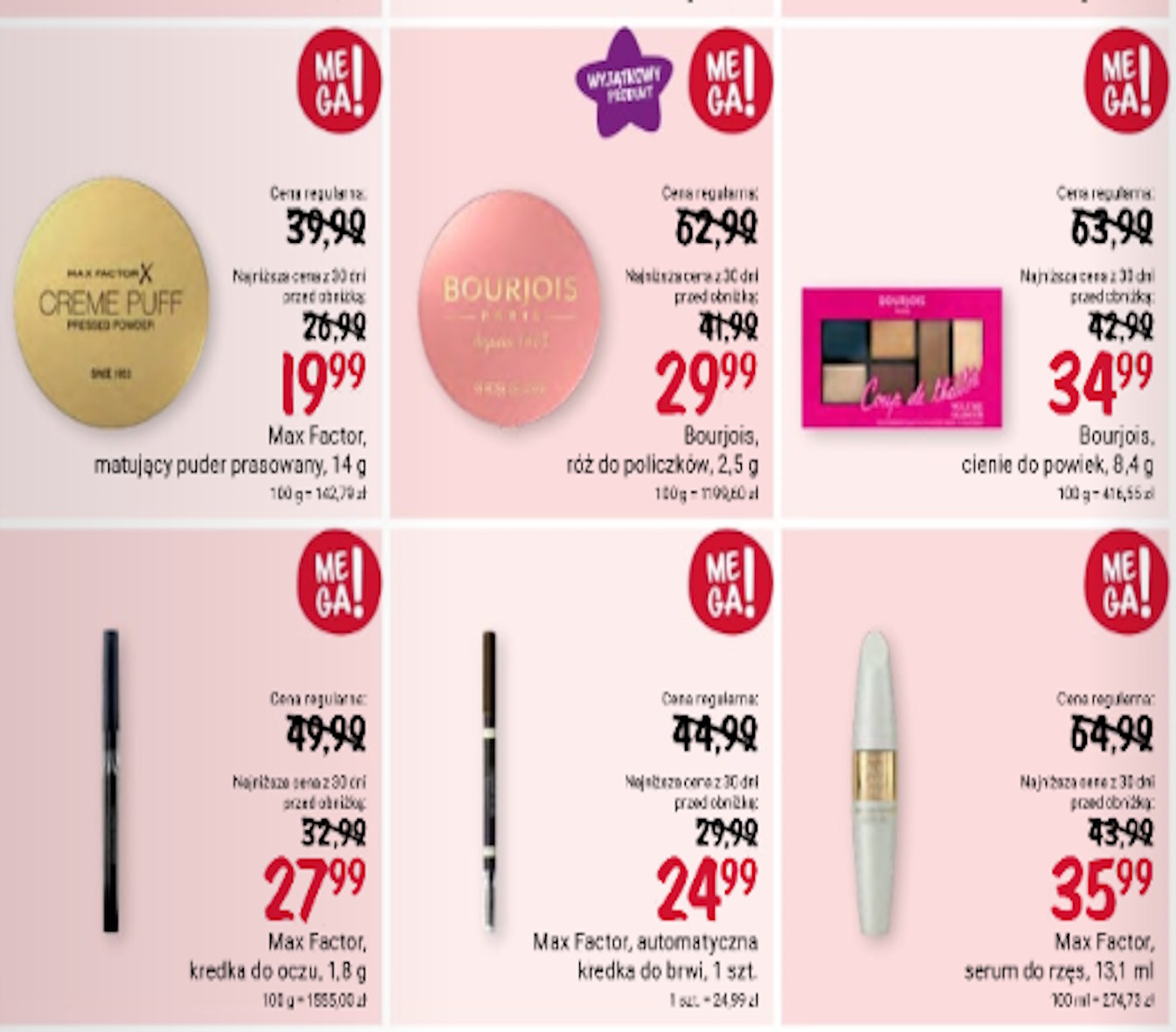 W ofercie promocyjnej znalazły się produkty, które są fundamentem codziennego makijażu – matujący puder prasowany Max Factor i róż do policzków Bourjois zapewnią perfekcyjne wykończenie każdego looku, dostępne teraz w cenie niższej o ponad połowę! To doskonała okazja, by dodać swojej twarzy świeżości i blasku za ułamek standardowej ceny.
