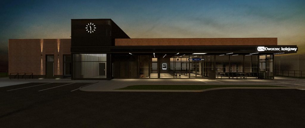 Nowy parterowy budynek to prostokątna bryła z dominantą w postaci wieży zegarowej, pokrytej pionowymi ciemnoszarymi listwami. Elewacja będzie wykończona cegłą licową, z dużymi przeszkleniami w części pasażerskiej, które zwiększą dostęp światła dziennego do wnętrza. Przed wejściem do dworca od strony frontu zaprojektowano daszek. Nowy budynek będzie posiadał również iluminację nocną, a także podświetlane napisy dworzec kolejowy (od frontu) oraz z nazwą miejscowości (od strony peronów). Niezwykle ważne jest również to, że znajdzie się on bliżej stacji oraz w sąsiedztwie tunelu prowadzącego na perony, co poprawi komfort korzystających z niego podróżnych.