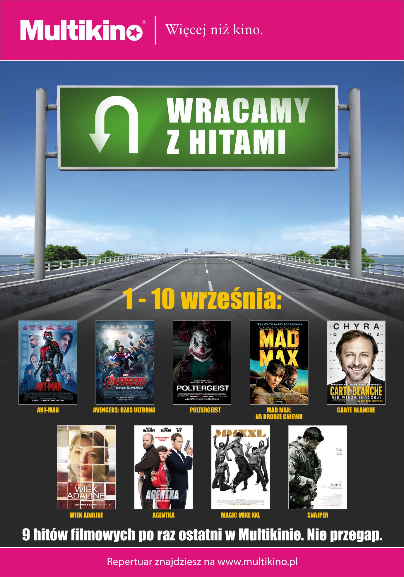 „Wracamy z hitami” w Multikinie to powrót na ekrany kin największych premier ostatnich miesięcy. Akcja trwa od 1 do 10 września i obejmie 9 filmów, w tym filmy 2D. Będzie to okazja do nadrobienia filmowych zaległości. W repertuarze znajdą się filmy 2D: „Snajper”,  „Wiek Adeline”, „Agentka”, „Mad Max: Na drodze gniewu”, „AntMan”, „Avengers. Czas Ultrona”, „Magic Mike XXL”, „Poltergeist”, „Carte Blanche”.