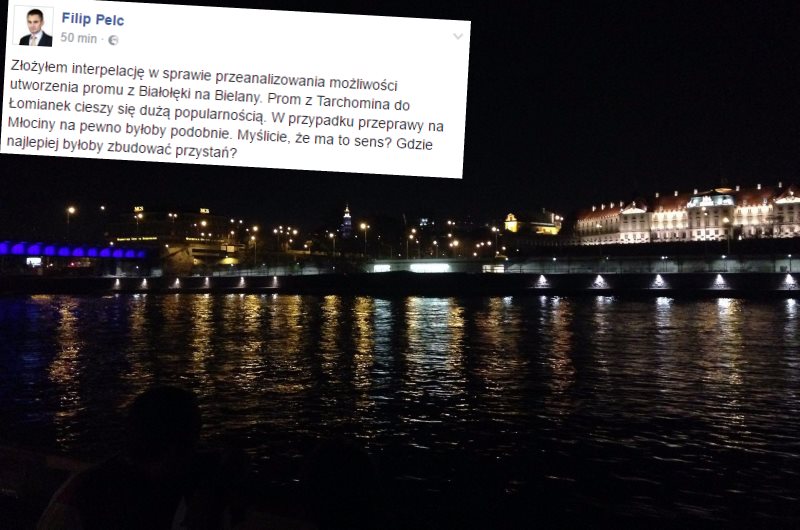 „Złożyłem interpelację w sprawie przeanalizowania możliwości utworzenia promu z Białołęki na Bielany. Prom z Tarchomina do Łomianek cieszy się dużą popularnością. W przypadku przeprawy na Młociny na pewno byłoby podobnie. Myślicie, że ma to sens? Gdzie najlepiej byłoby zbudować przystań?”.