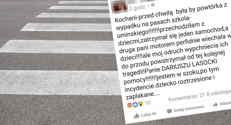 „Kochani – przed chwilą byłaby powtórka z wypadku na pasach szkoła – Umińskiego! Przechodziłam z dziećmi, zatrzymał się jeden samochód, a druga pani motorem perfidnie wjechała w dzieci! Ale mój odruch wypchnięcia ich do przodu powstrzymał od kolejnej tragedii! Panie DARIUSZU LASOCKI pomocy! Jestem w szoku, po tym incydencie. Dziecko roztrzęsione i zapłakane…” – pisze użytkowniczka Facebooka.