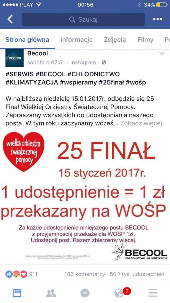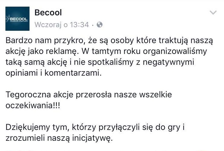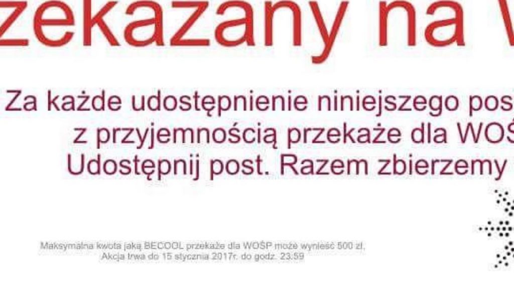 Pewna firma chciała wspomóc Wielką Orkiestrę Świątecznej pomocy. Za każde udostępnienie posta obiecali jedną złotówkę na WOŚP. Był jednak zapis małą czcionką, który mówił: „Maksymalna kwota, jaką BECOOL przekaże na WOŚP może wynieść 500zł.”. Popularność akcji najwyraźniej zaskoczyła firmę. Udostępnień było… ponad 50 tysięcy! Użytkownicy zaczęli komentować wpis o kwocie 500zł. Firma odniosła się do slow krytyki. Wpisy zniknęły już z Facebooka. Jakie jest Wasze zdanie, to reklama czy chęć pomocy?