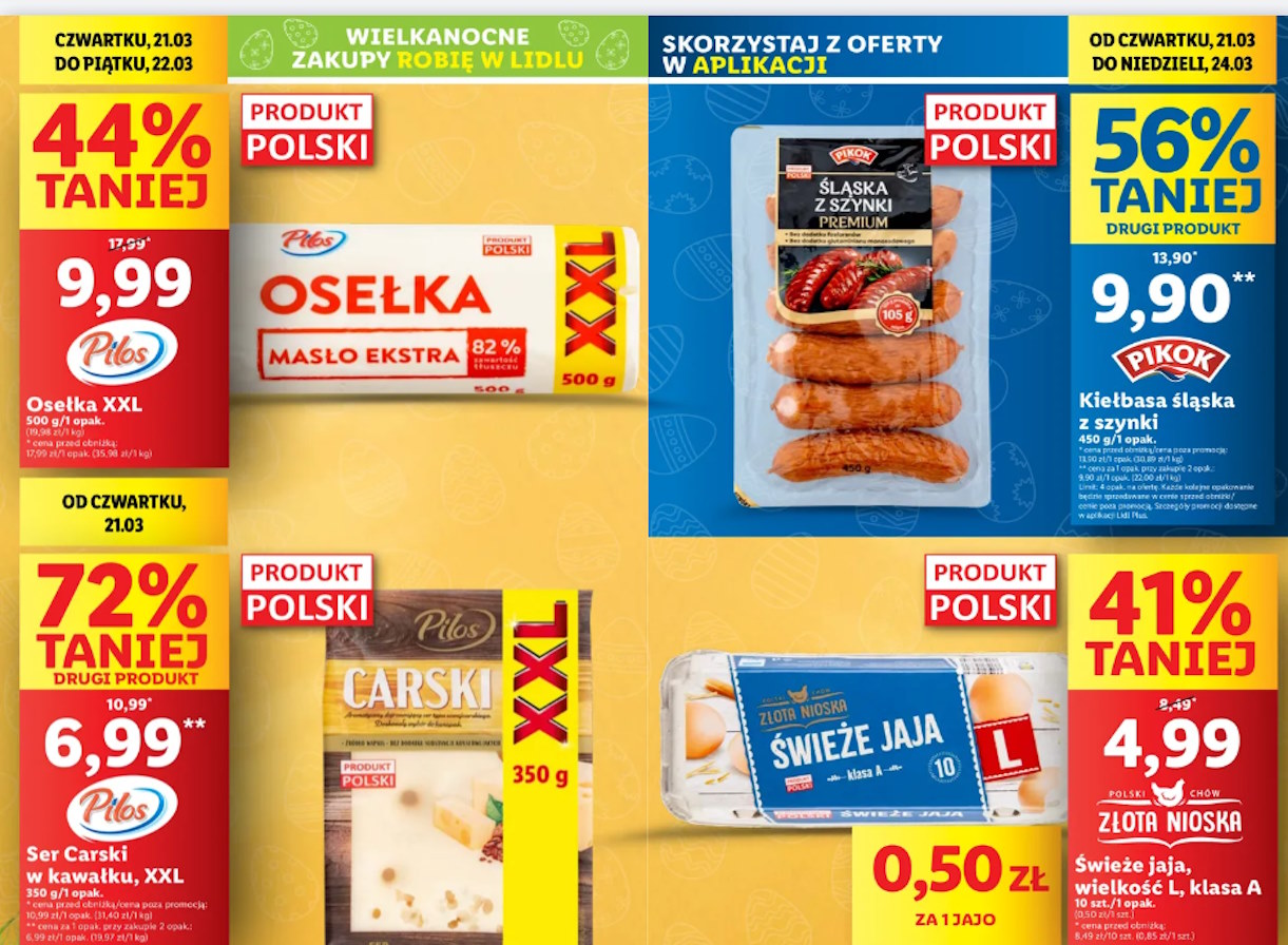 W niedzielę, 24 marca, klienci mogą skorzystać z jeszcze lepszych okazji. Świeże jaja marki Złota Nioska w ilości 10 sztuk są oferowane z 41% rabatem, w cenie 4,99 zł. Dodatkowo, klientów posiadających aplikację Lidl Plus czeka specjalna niespodzianka – Kiełbasa śląska z szynki w cenie promocyjnej 9,90 zł, co oznacza 56% oszczędności w porównaniu do standardowej ceny.