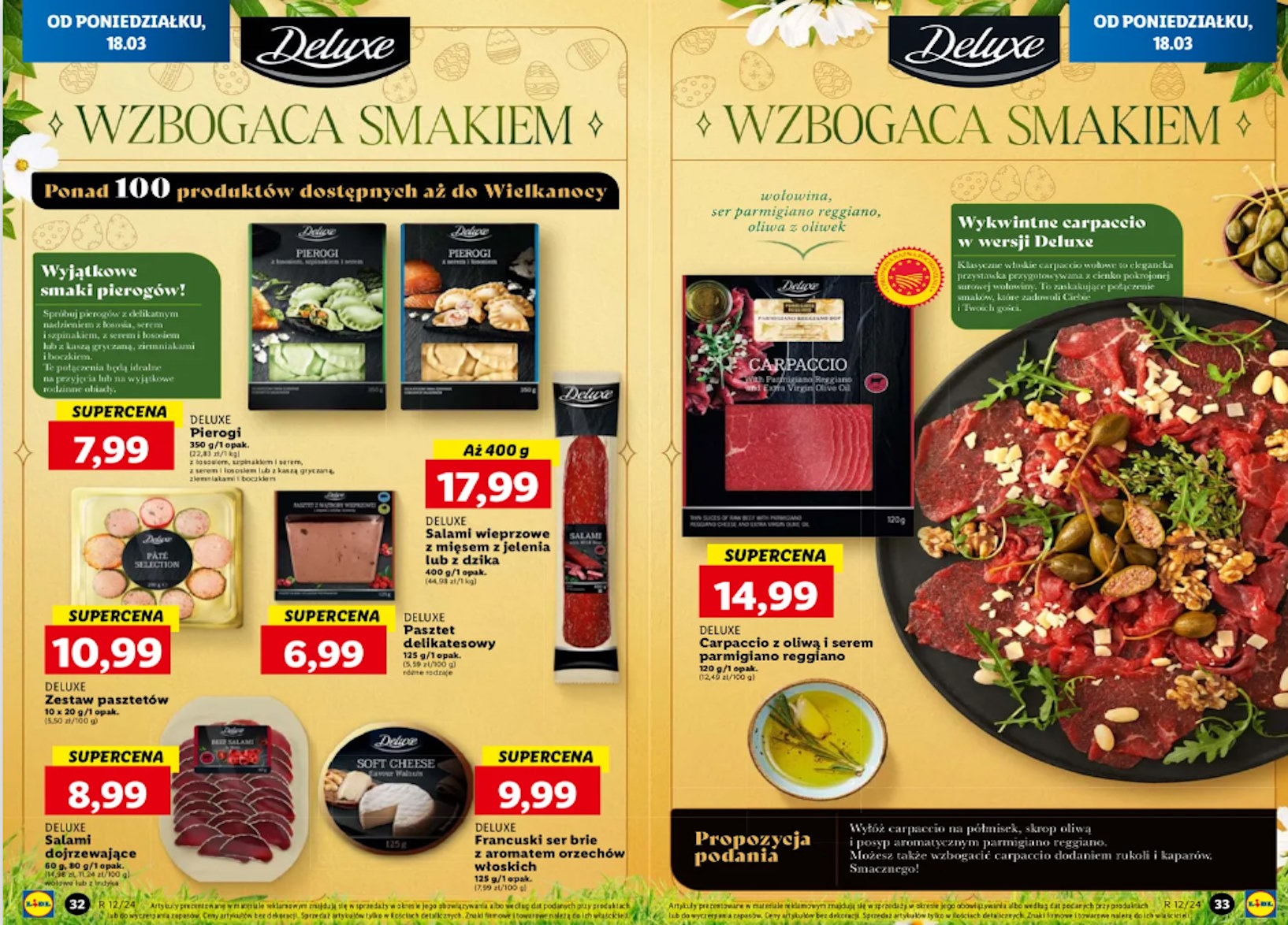 Ale to nie wszystko. Z okazji świąt, Lidl ma w ofercie coś specjalnego – wykwintne carpaccio w wersji Deluxe za jedynie 14,99 zł. Carpaccio z polędwicy wołowej z dodatkiem aromatycznego sera Parmigiano Reggiano i oliwy z oliwek to propozycja, która może stanowić serce każdej świątecznej uczty.
