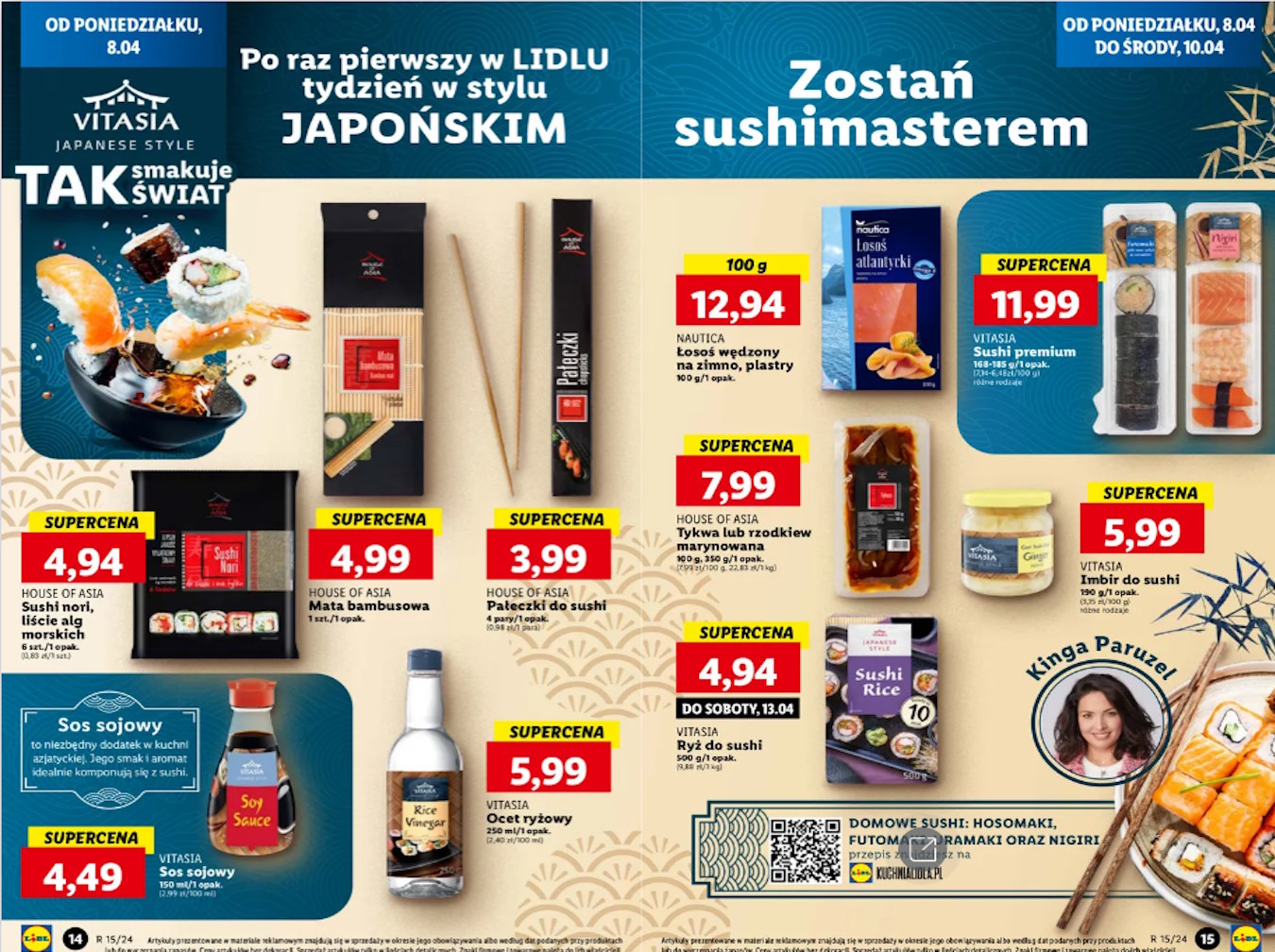 Dodatkowo, Lidl zaprasza swoich klientów do zostania „sushimasterem” – dzięki atrakcyjnemu asortymentowi, każdy może spróbować stworzyć swoje własne sushi. W ofercie znajdują się również składniki, takie jak nori – wodorosty morskie, łosoś atlantycki w plastrach idealny do sashimi oraz tykwa lub rzodkiew marynowana, które są często wykorzystywane w japońskiej kuchni.
