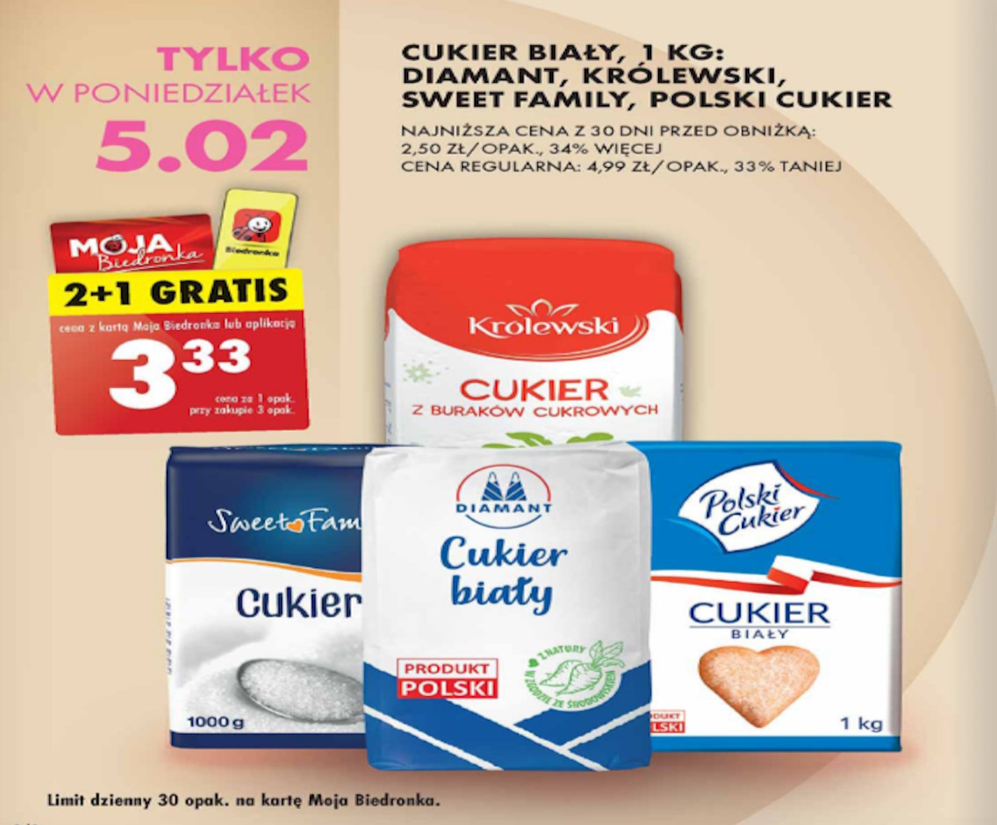 Ale to nie wszystko. Biedronka oferuje również z kartą Moja Biedronka lub aplikacją promocję 2+1 gratis na cukier, co oznacza, że przy zakupie trzech opakowań, za trzecie nie zapłacimy nic. Dzięki temu, cena za opakowanie spada do rekordowo niskich 3,33 zł, co jest ofertą nie do przegapienia.