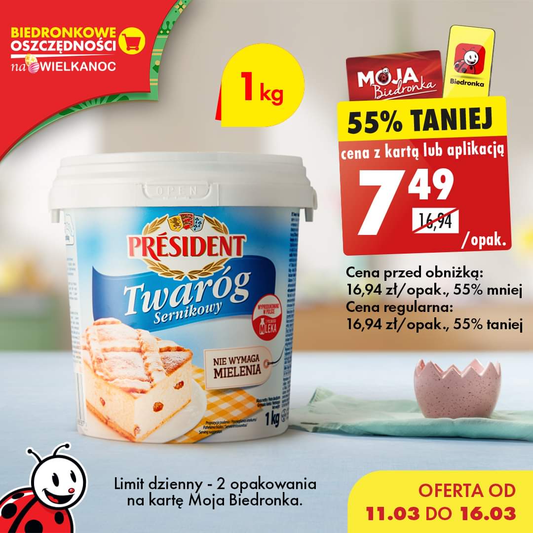 Chodzi o ofertę na twaróg marki President w wygodnej 1-kilogramowej opakowaniu, który jest niezbędnym produktem na wielkanocnym stole. Twaróg ten, używany często do przygotowania tradycyjnego sernika, jest teraz dostępny w promocyjnej cenie 7,49 zł za opakowanie, co stanowi aż 55% oszczędności w porównaniu do regularnej ceny 16,94 zł.