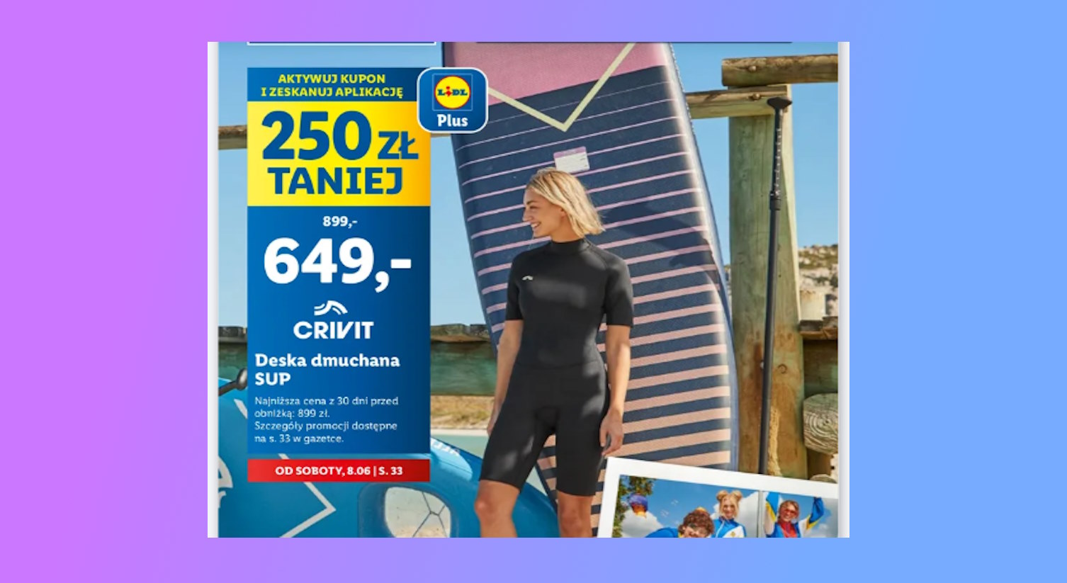 Od najbliższego tygodnia w sklepach sieci Lidl można spodziewać się wzmożonego ruchu. Wszystko za sprawą wyjątkowej oferty na dmuchaną deskę SUP marki Crivit, która zostanie przeceniona o aż 250 złotych. To znakomita okazja dla miłośników sportów wodnych oraz osób poszukujących atrakcyjnego sprzętu na nadchodzące wakacje.