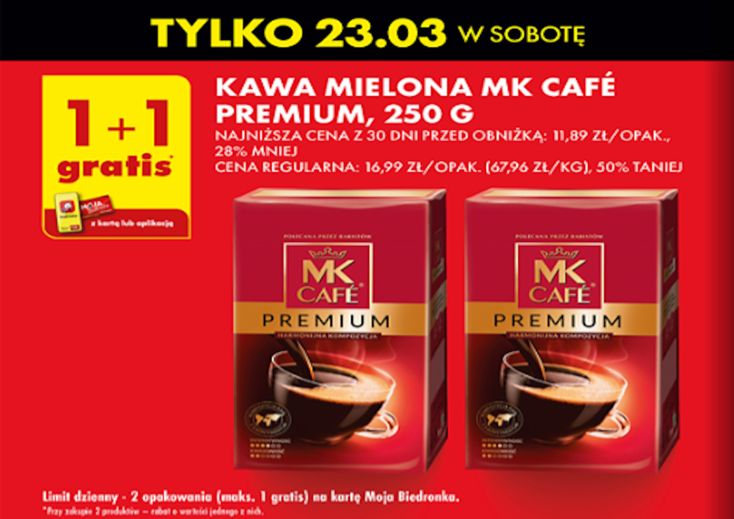 Oferowane w pakietach po 250 g, kawa MK Café będzie dostępna w obniżonej cenie 11,89 zł za opakowanie, co stanowi 50% oszczędności w stosunku do regularnej ceny wynoszącej 16,99 zł. Limit zakupów to dwie opakowania na kartę „Moja Biedronka”, co pozwala na sprawiedliwe podzielenie promocji między większą liczbę klientów.