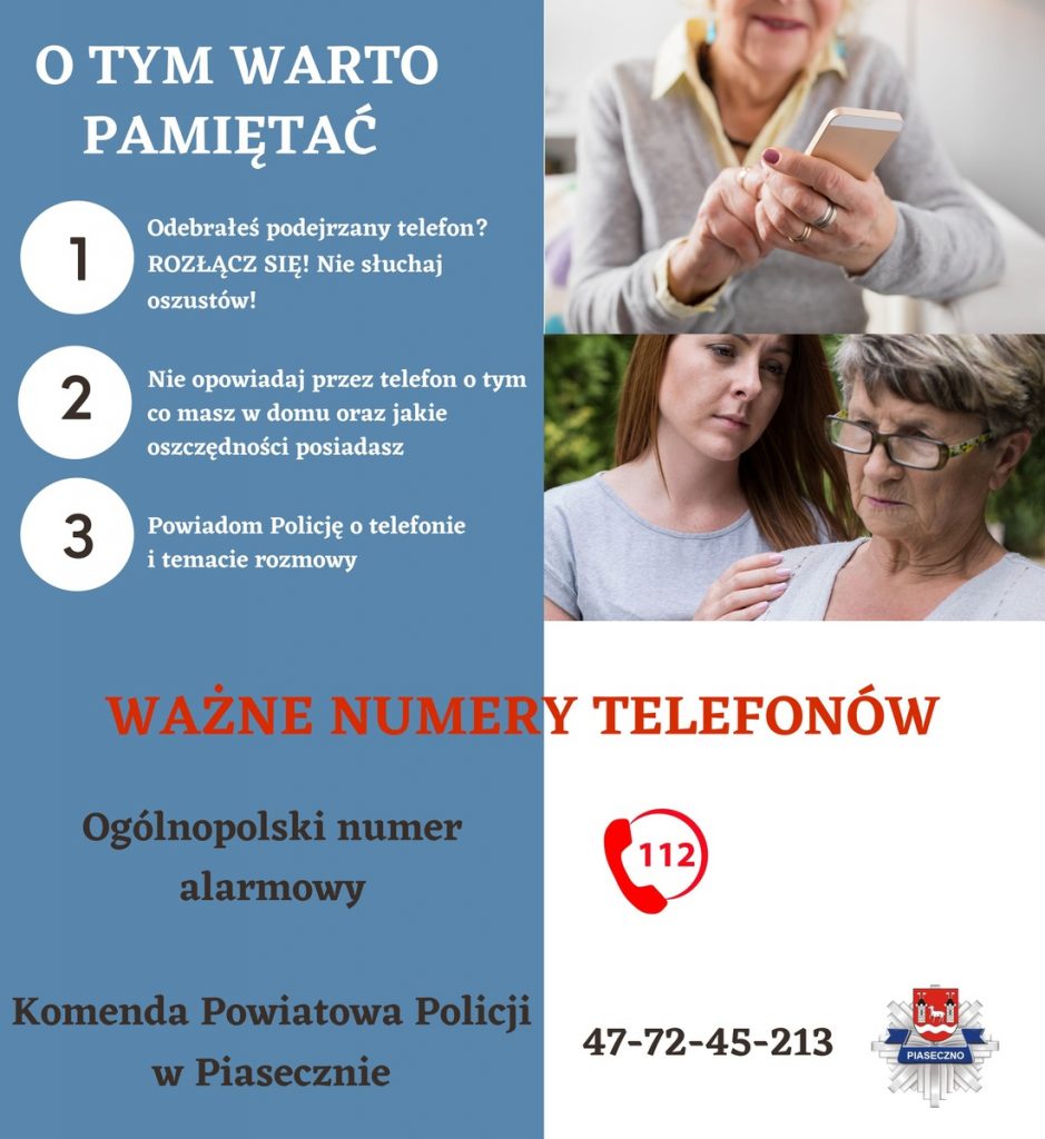 Na numer stacjonarny 76-letniego mieszkańca powiatu piaseczyńskiego zadzwonił mężczyzna podający się za funkcjonariusza policji. W trakcie krótkiej rozmowy poinformował, że syn seniora spowodował wypadek w którym ucierpiała kobieta będąca w zaawansowanej ciąży. Jedynym sposobem aby uniknąć aresztowania było przekazanie ogromnej sumy pieniędzy, która miała pomóc w uniknięciu aresztowania.