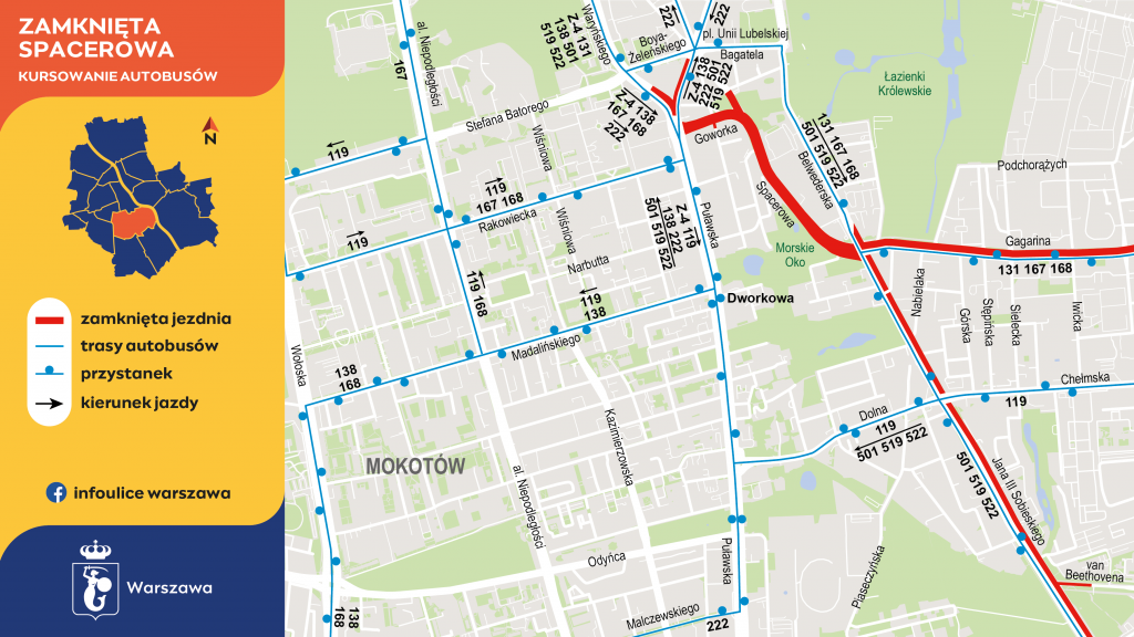 Autobusy linii 167 i 168, w obu kierunkach pojadą od Puławskiej ulicami L. Waryńskiego, T. Boya-Żeleńskiego, Bagatela, Belwederską do swoich tras.