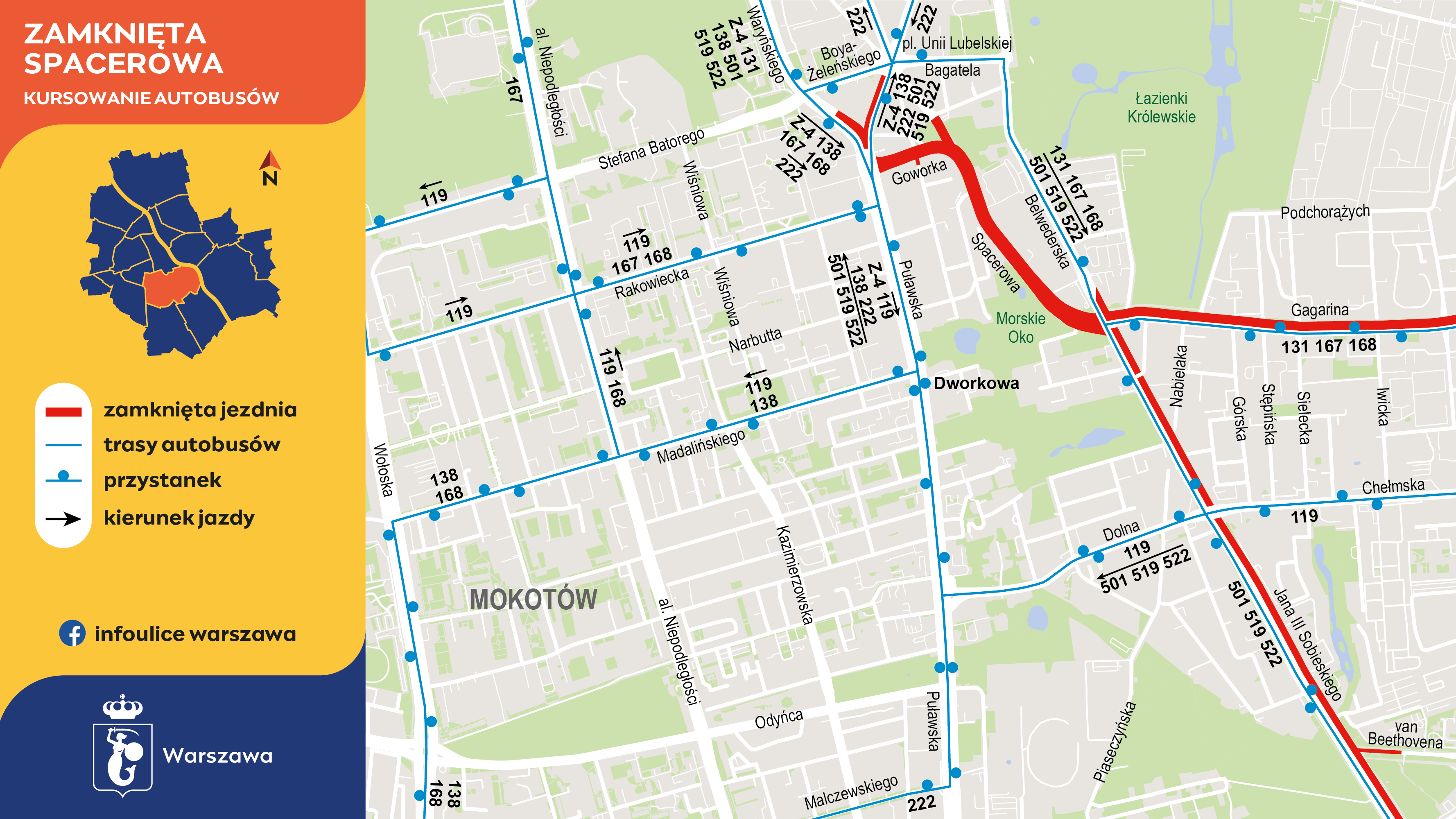 Autobusy linii 131, N31 i N81 w obu kierunkach, od skrzyżowania ulic L. Waryńskiego i S. Batorego, pojadą ulicami T. Boya-Żeleńskiego, Bagatela i Belwederską do J. Gagarina. Podobną trasą pojadą 501, 519 i 522 – ale tylko w kierunku Stegien i Wilanowa. W stronę centrum nadal będą podjeżdżać ulicą Dolną do Puławskiej, a następnie przez pl. Unii Lubelskiej i ulicami T. Boya-Żeleńskiego, L. Waryńskiego dojadą do dworca Centralnego i pl. Konstytucji, mijając stację metra Politechnika.
