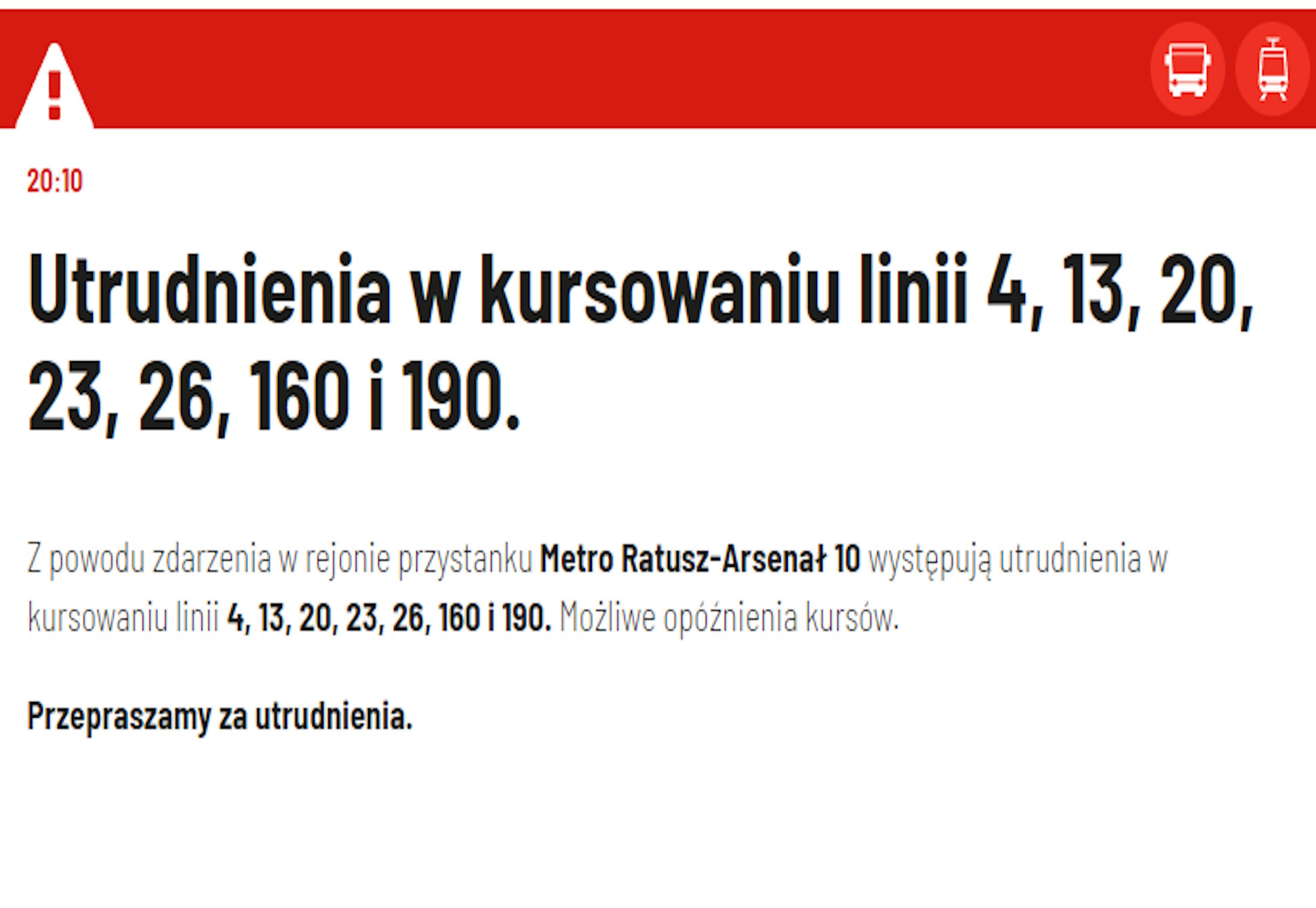 Zgodnie z komunikatem WTP, utrudnienia dotyczą linii tramwajowych numer 4, 13, 20, 23, 26 oraz autobusowych 160 i 190. Sytuacja ta wymusiła wprowadzenie tymczasowych tras objazdowych, co może prowadzić do wydłużenia czasu podróży pasażerów korzystających z tych linii. Warszawski Transport Publiczny informuje: „Z powodu zdarzenia w rejonie przystanku Metro Ratusz-Arsenał 10 występują utrudnienia w kursowaniu linii 4, 13, 20, 23, 26, 160 i 190. Możliwe opóźnienia kursów.”