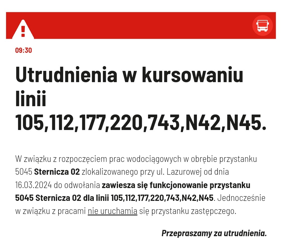 Siedem linii autobusowych, w tym 105, 112, 177, 220, 743 oraz nocne N42 i N45, zostały zmuszone do zmiany tras z powodu rozpoczęcia prac wodociągowych przy przystanku 5045 Sternicza 02, znajdującym się przy ulicy Lazurowej. Zmiany te weszły w życie od 16 marca 2024 roku i będą obowiązywać do odwołania.