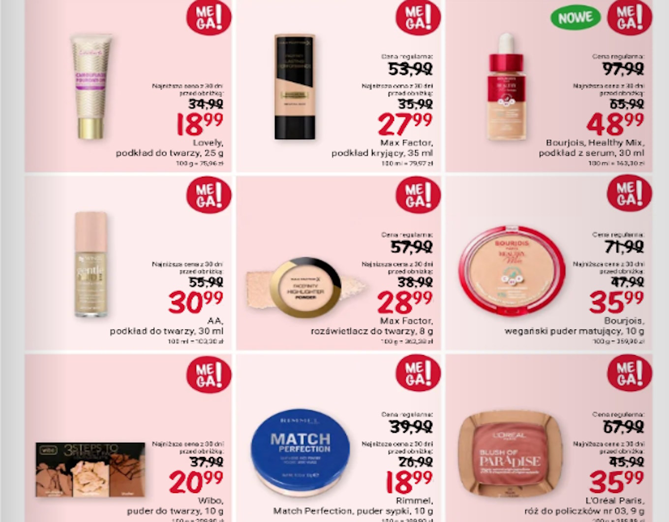Wśród promocyjnych ofert znajdziemy podkłady do twarzy, które zapewnią idealnie gładką skórę i będą bazą do tworzenia codziennego lub wieczorowego looku. Klienci mogą liczyć na znaczące obniżki cen – na przykład podkład Lovely, teraz w cenie 18,99 zł zamiast 34,99 zł, czy Max Factor w promocyjnej cenie 27,99 zł, obniżonej z 53,99 zł. Takie zniżki to idealna okazja, aby wypróbować nowe produkty lub uzupełnić ulubione.