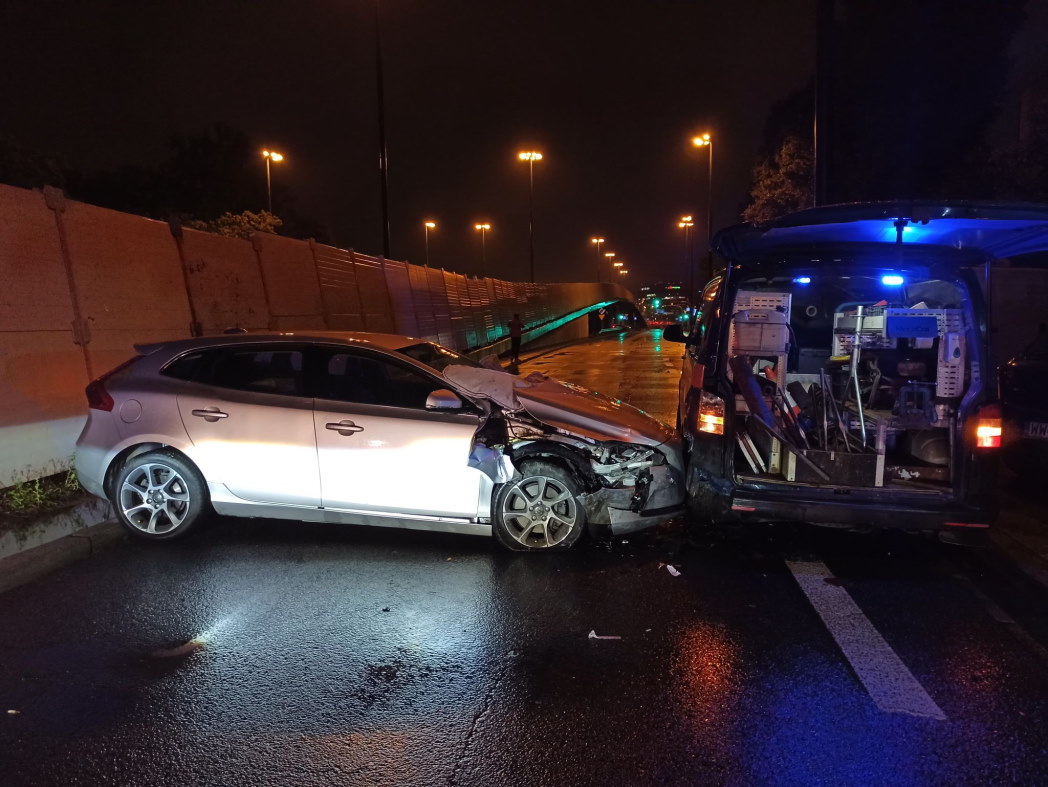 Jak udało nam się ustalić volvo wpadło w poślizg i uderzyło w oznakowany pojazd wodociągów warszawskich które tutaj pracowały na miejscu.