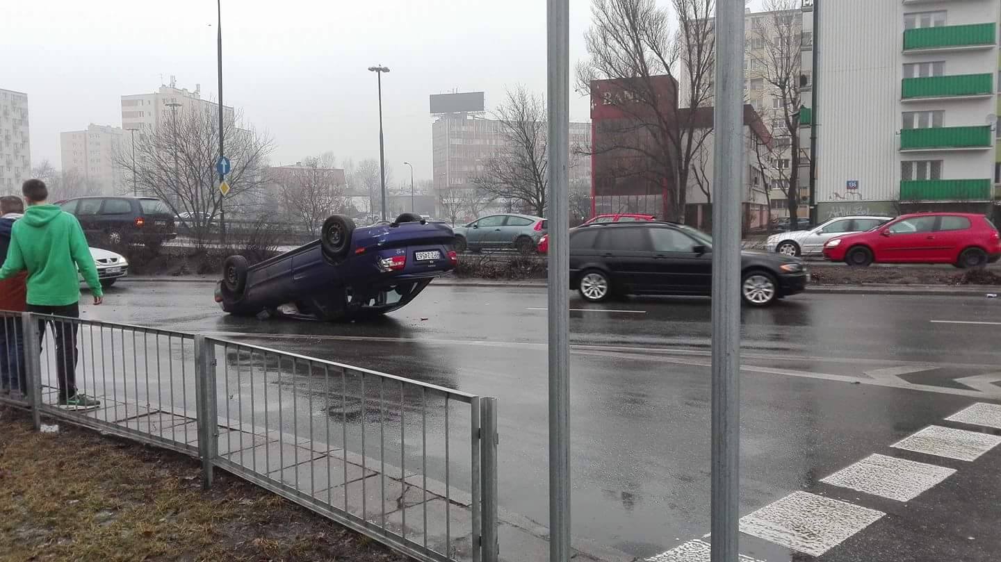 Na łuku Ostrobramskiej kierowca wpadł w poślizg i dachował. Na szczęście nikomu nic się nie stało. Zdjęcia dzięki uprzejmości Pragi Południe na Sygnale.