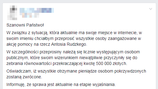 OŚWIADCZENIE w związku ze zbiórką na Antosia Rudzkiego