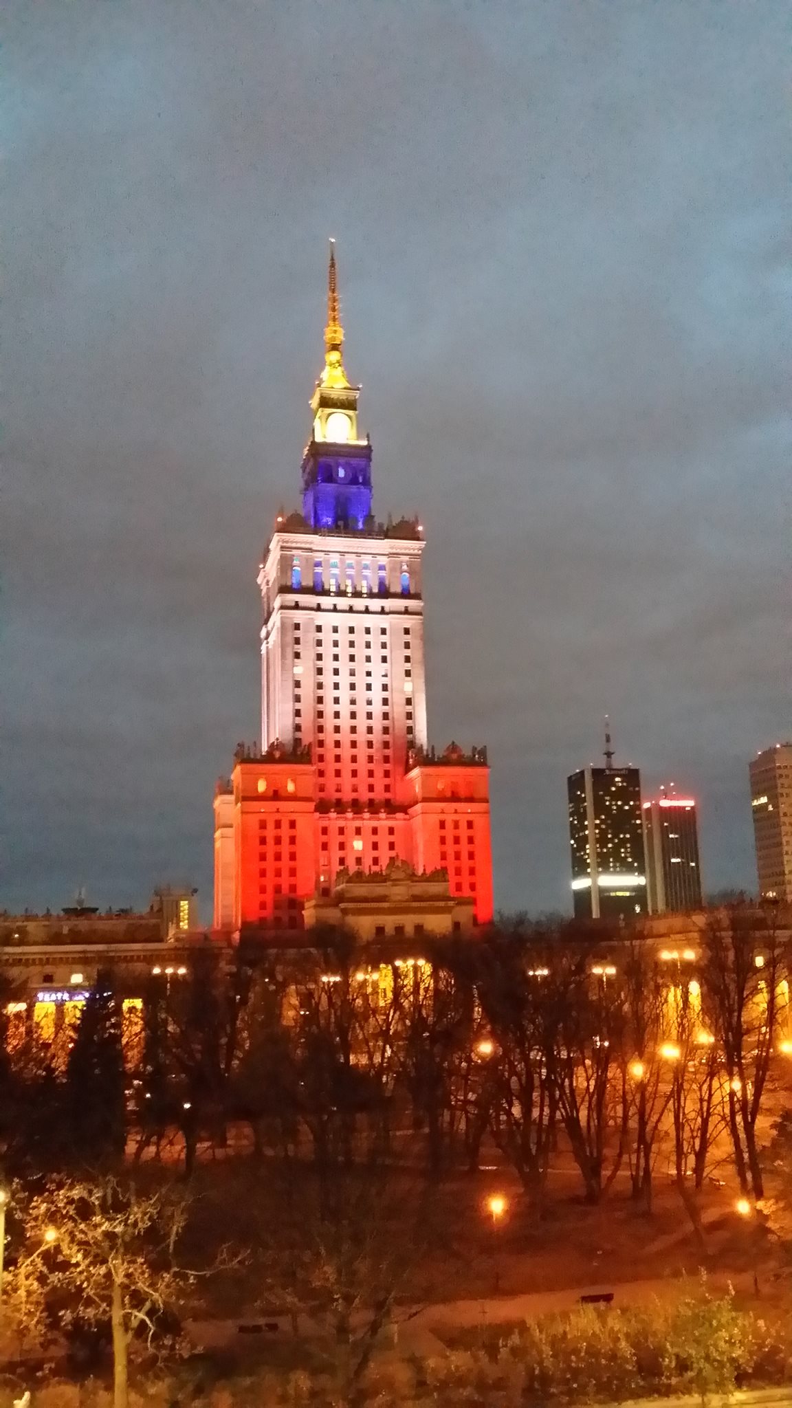 Pałac Kultury i Nauki w Warszawie rozbłysnął niebiesko-biało-czerwonym światłem w geście solidarności naszego miasta z Paryżem.