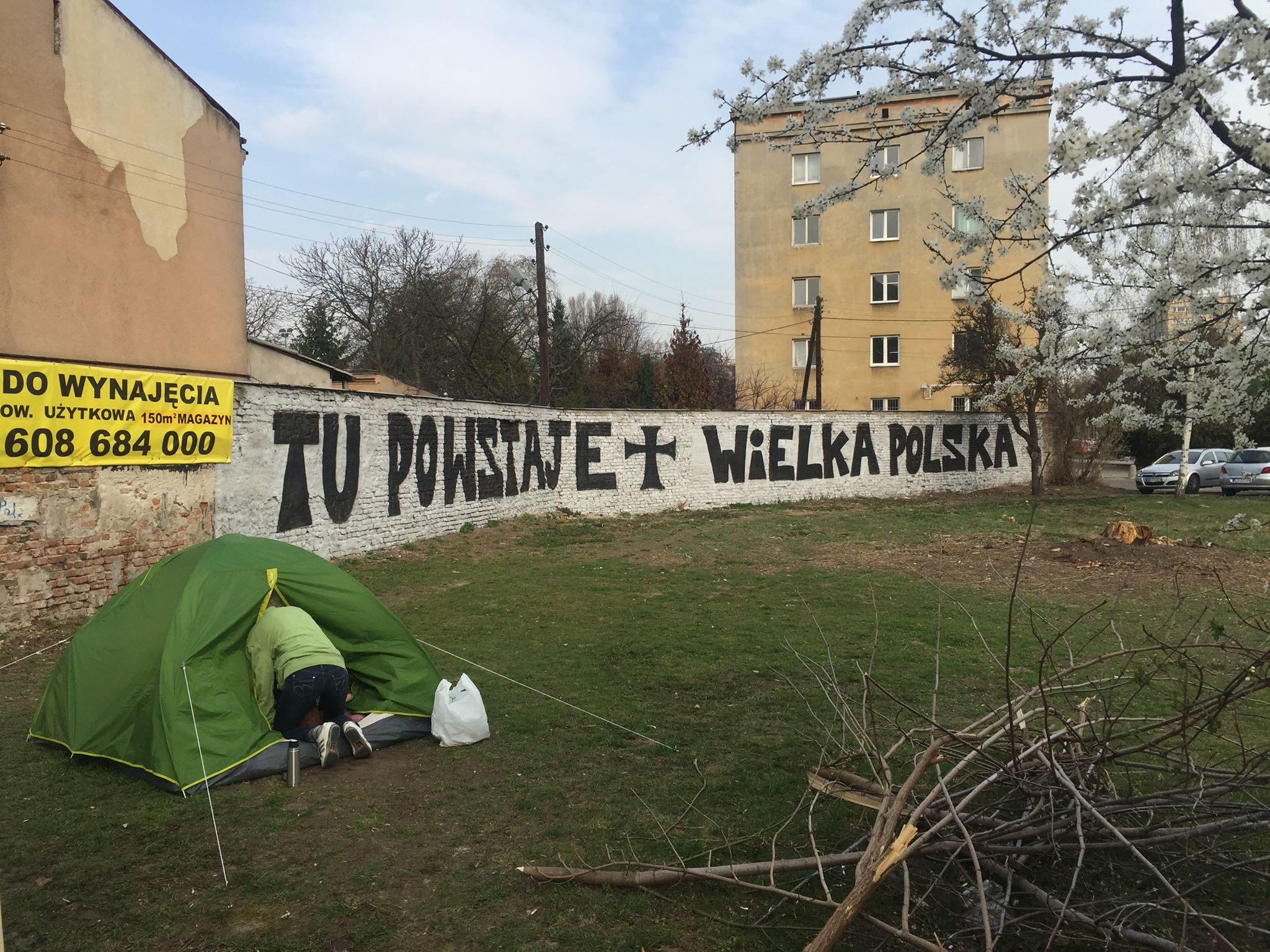 „Pan, Pani i dwa pieski mieszkają od ponad miesiąca w namiocie na rogu Traktorzystki i Księcia Janusza. Nie są żulami. Czekają na mieszkanie socjalne – na 21 miejscu w kolejce. Przyjmą każdą pomoc. W międzyczasie pojawił się napis, który tylko dopełnia absurdu sytuacji.” – opisuje Marceli Gawryś