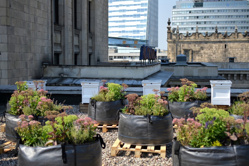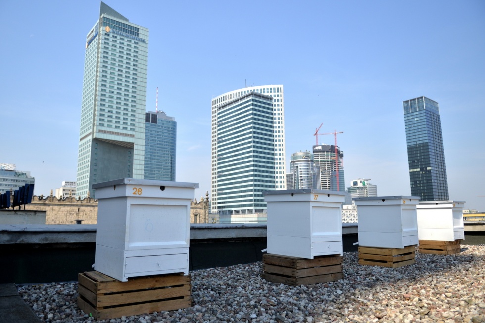 Pierwsza miejska pasieka, składająca się z czterech uli i szeregu miododajnych krzewów i bylin, powstała na dachu Teatru Studio w Pałacu Kultury i Nauki. W przenośnym, przyulowym ogródku pożyteczne owady mają do dyspozycji sezonowe kwiaty: kocimiętkę, rozchodniki, w kilku, kwitnących kolejno po sobie odmianach oraz pachnące budleje i wrzosy.