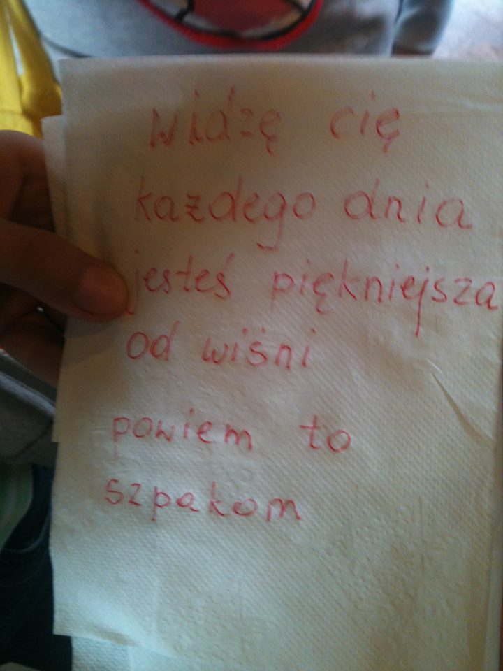 „Młodszy uśmiechał się do nich, chcąc złapać kontakt wzrokowy. Zachowywał się jak chłopak, który zaleca się do dziewczyny. I to był znak że coś jest nie tak! Po 30-40 minutach gdy dziewczynki szykowały się do wyjścia Młodszy powiedział do kolegi że idzie do samochodu. Stary podszedł do dziewczynek i dał im serwetkę z zapiskami. Gdy wyszedł z budynku podeszłam do dziewczyn zobaczyć i sfotografować tekst. Ostrzegłam je aby uważały i wyszłam z restauracji. Na parkingu stała mała czarna (…) tyłem i siedzieli w niej dwaj mężczyźni. Czy to byli oni? , tego nie jestem pewna na 100 % Piszę to do znajomych z okolic Bemowa ponieważ może być tak że dziś byli tu a następnym razem przy Wrocławskiej lub gdzieś przy szkołach. Na pewno szykowali się do opuszczenia restauracji w tym samym czasie co dziewczynki. Szukali zaczepki.