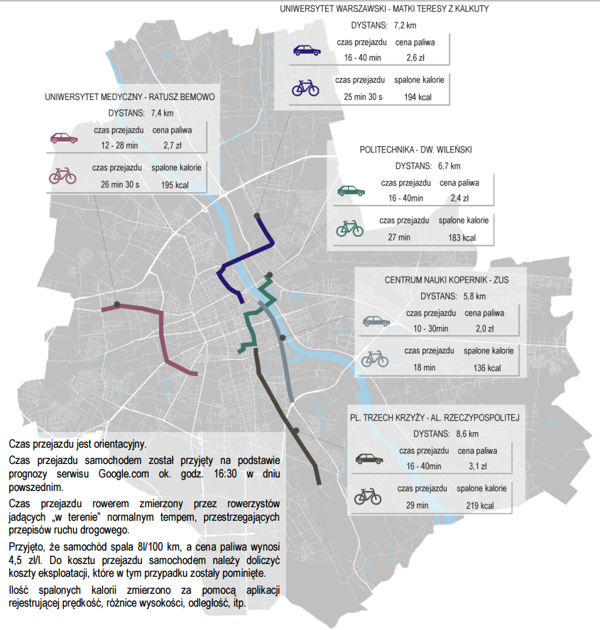 Pełnomocnik Prezydenta m.st. Warszawy ds. komunikacji rowerowej przedstawił infografikę z „Raportu Rowerowego 2015”, która porównuje czas przejazdu rowerem i samochodem na pięciu trasach. Biorąc pod uwagę korki to w godzinach szczytu wychodzi na to, że rower jest szybszy lub tak samo szybki jak samochód. Zresztą zobaczcie sami.