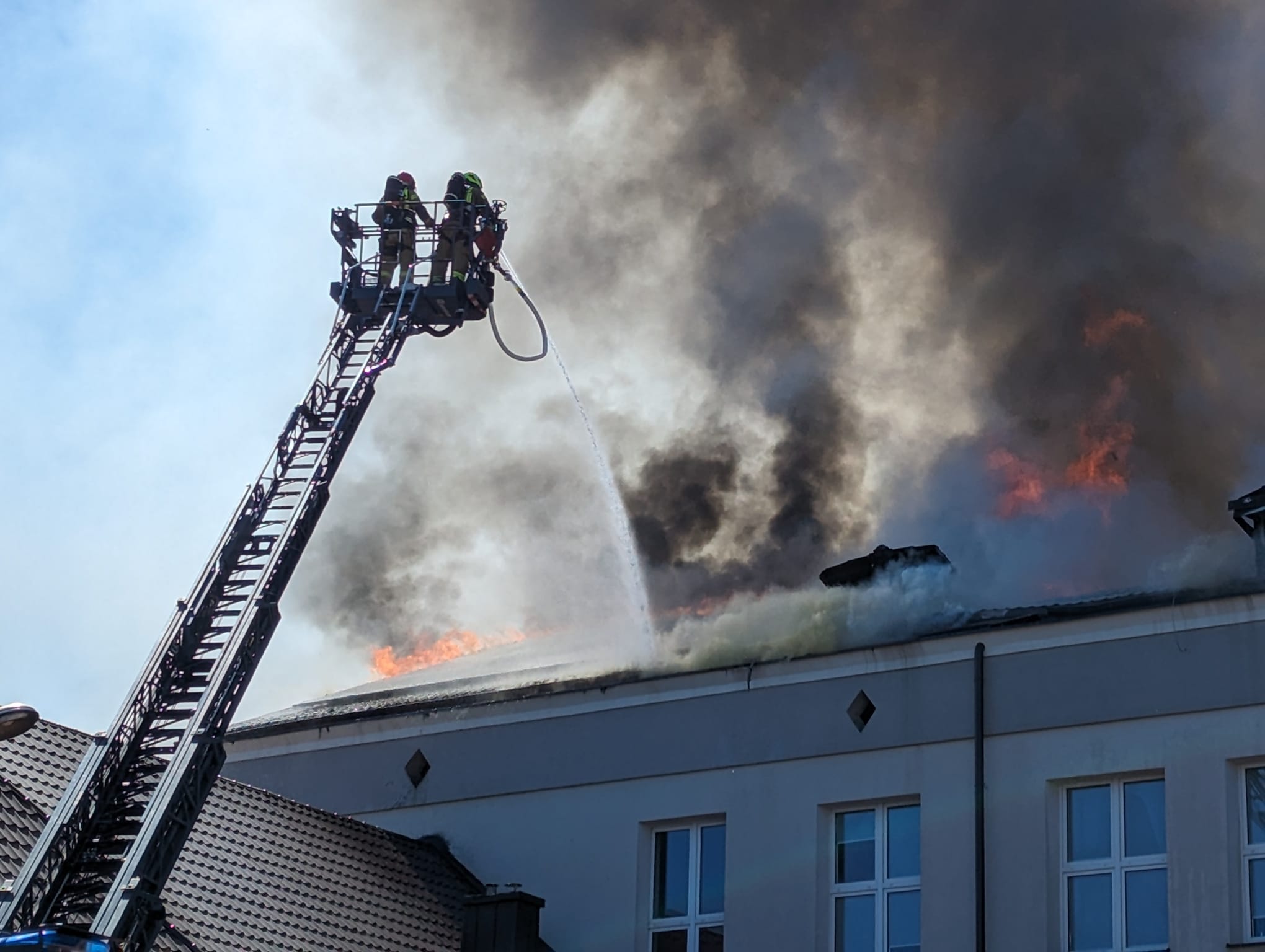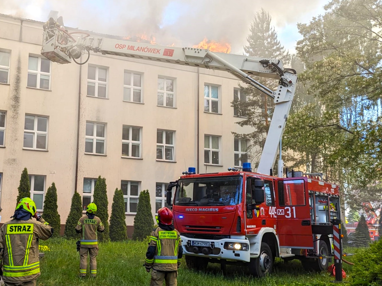 Piekło na dachu grodziskiej szkoły! Ewakuacja maturzystów! Strażacy w batalii z żywiołem