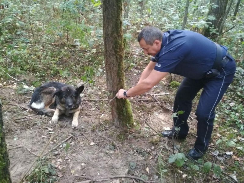 O sytuacji mundurowych poinformowała kobieta, która usłyszała skowyt psa dobiegający z lasu. Wspólnie z policjantami poszła w jego kierunku. Po 1,5 godziny poszukiwań przy jednym z drzew policjanci zauważyli zwierzę z owiniętą wokół szyi stalową linką. Dzielnicowy odplątał linkę, która zaciskała się na szyi psa. Po uwolnieniu zwierzę ruszyło w stronę domu. Policjanci dotarli do właściciela, który poinformował, że zwierzak uciekł z posesji. Na szczęście cały i zdrowy wrócił do domu.