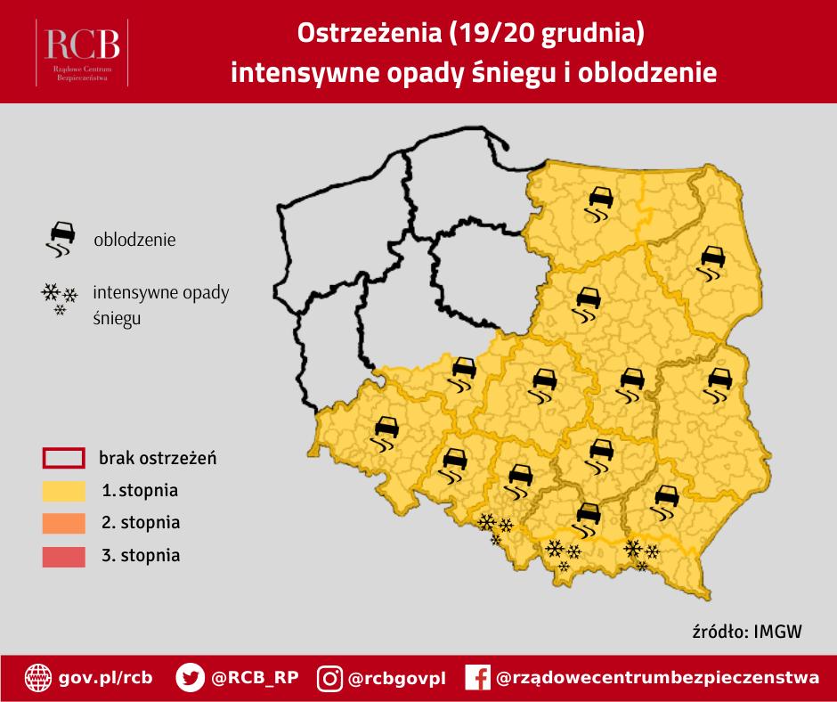 „Uważajcie na drogach! Dziś i jutro będzie bardzo ślisko – Instytut Meteorologii i Gospodarki Wodnej – IMGW PIB ostrzega przed oblodzeniami oraz intensywnymi opadami śniegu. Jedźcie ostrożnie!” – informuje Rządowe Centrum Bezpieczeństwa.