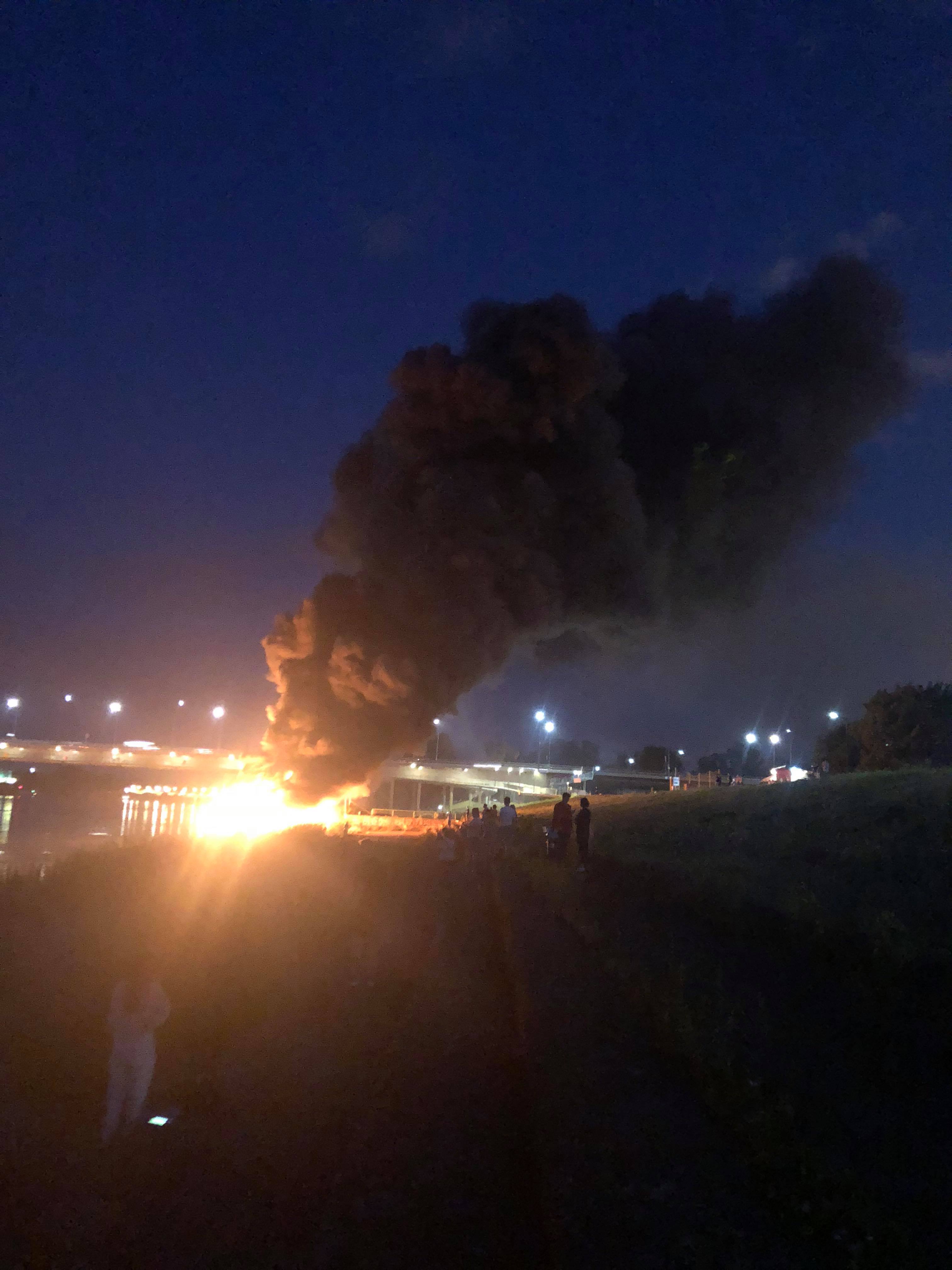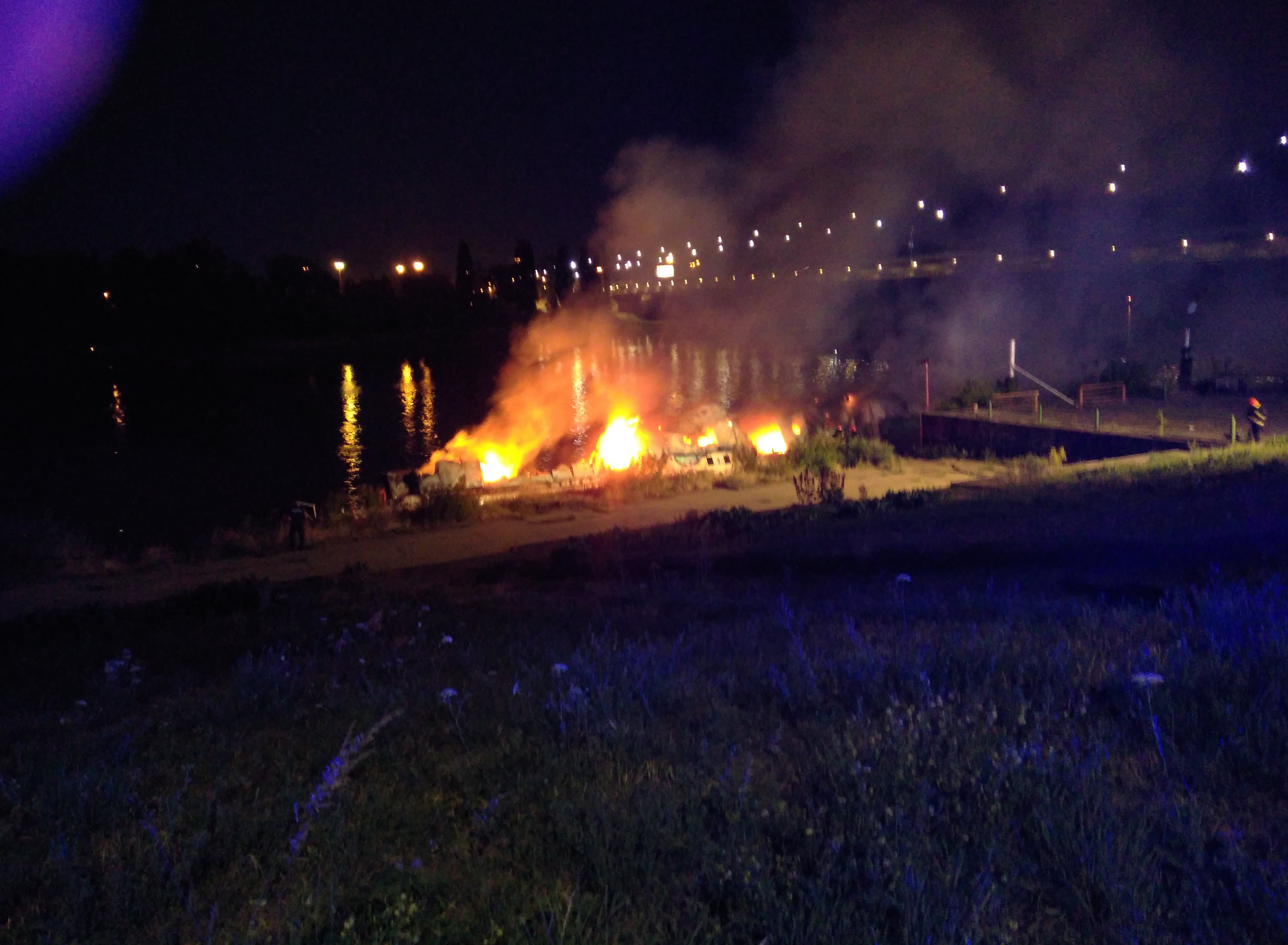 Płonie barka przy Moście Łazienkowskim. Jednostka tonęła już w zimie. Potem było o niej głośno, gdy ktoś zawiesił na niej baner: „Platforma Obywatelska”.