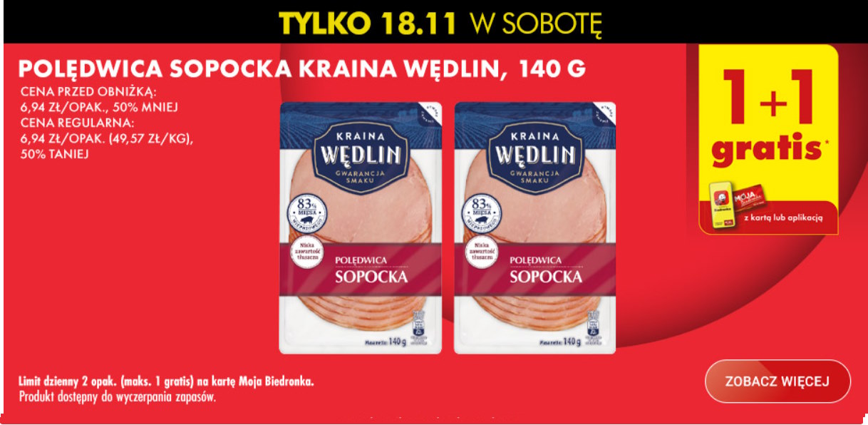 18 listopada 2023, Polska – Sieć sklepów Biedronka ogłosiła specjalną, jednodniową promocję na popularny produkt – polędwicę sopocką marki Kraina Wędlin. W sobotę, 18 listopada, klienci będą mogli skorzystać z atrakcyjnej oferty 1 + 1 gratis, co oznacza, że przy zakupie dwóch opakowań polędwicy sopockiej, drugie otrzymają bez dodatkowych kosztów.