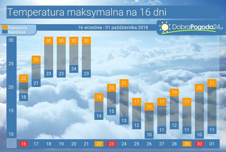W najbliższych dniach Polska pozostanie pod wpływem pola wyżowego, jednocześnie w tym czasie w rejonie Wysp Brytyjskich pojawią się ośrodki niżowe. Taka sytuacja baryczna spowoduje adwekcję ciepłego powietrza do południowej, środkowej i zachodniej Europy. W naszym kraju czeka nas stopniowy wzrost temperatur w towarzystwie Słońca, aż do około 21 września, gdy na termometrach zanotujemy przeważnie 26-30 st. C.