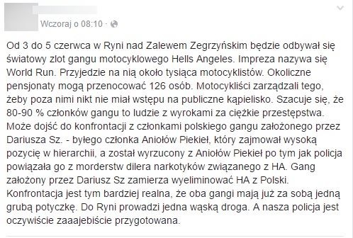 Od dziś do 5 czerwca w Ryni nad Zalewem Zegrzyńskim będzie odbywał się światowy zlot motocyklistów z Hells Angeles. Impreza nazywa się World Run. Przyjedzie na nią około tysiąca motocyklistów. Opis, który dostaliśmy na naszą skrzynkę kontaktową wygląda niepokojąco.