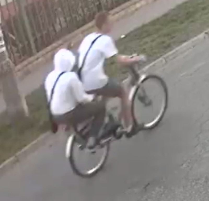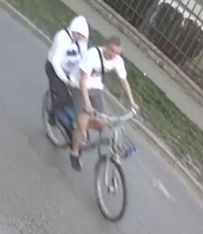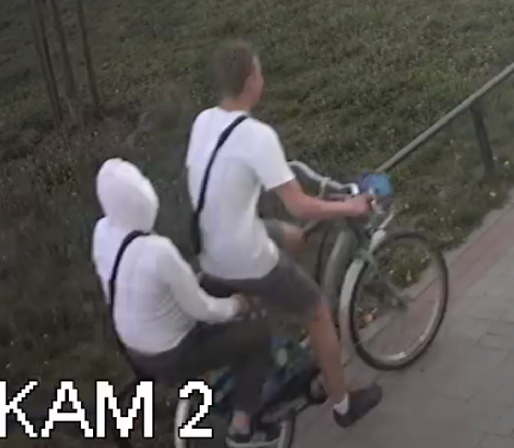 Rysopis mężczyzn: wiek około 17 lat; kierujący rowerem: włosy jasne krótkie, koszulka biała z napisem, szare krótkie spodenki, czarne buty sportowe, białe skarpetki „stópki”, przez klatkę piersiową miał przewieszoną czarną torebkę. Pasażer jadący na bagażniku: biała bluza z kapturem z n/n wzorem na klatce piersiowej, ciemne spodnie, przez klatkę piersiową przewieszona czarna torebka.