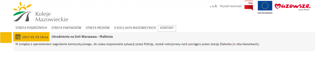 „W związku z ujawnieniem zagrożenia terrorystycznego, do czasu rozpoznania sytuacji przez Policję, został wstrzymany ruch pociągów przez stację Zielonka (w obu kierunkach)” – głosił komunikat Kolei Mazowieckich.