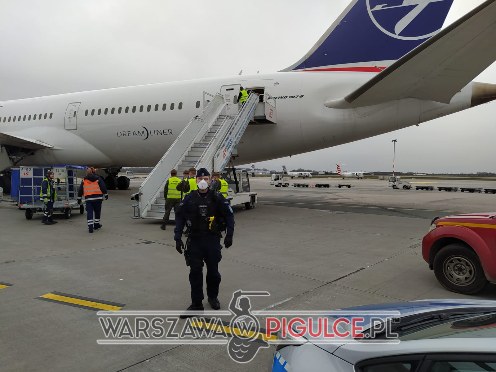Codziennie na Lotnisko Chopina przylatuje kilkadziesiąt samolotów z naszymi rodakami. Policjanci z KPPL Warszawa Okęcie z pionu prewencji i kryminalnego zabezpieczają przyloty na płycie lotniska, udzielając wsparcia służbie medycznej, Straży Granicznej oraz Wojskom Obrony Terytorialnej. Lotniskowi stróże prawa wspólnie z funkcjonariuszami Oddziału Prewencji Policji zabezpieczają również drogi przejścia, przemieszczających się po lotnisku podróżnych udzielając im niezbędnych informacji o możliwościach dotarcia do środków transportu z Lotniska Chopina do planowanego miejsca kwarantanny.
