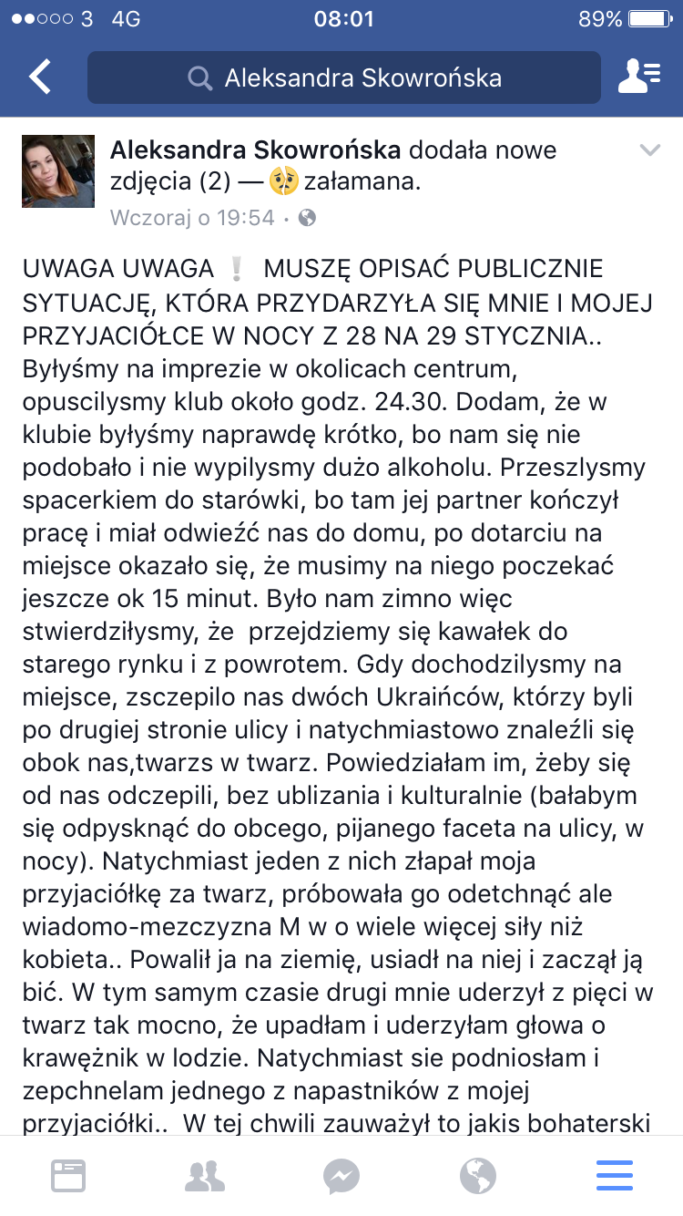„Byłyśmy na imprezie w okolicach centrum, opuscilysmy klub około godz. 24.30. Dodam, że w klubie byłyśmy naprawdę krótko, bo nam się nie podobało i nie wypilysmy dużo alkoholu. Przeszlysmy spacerkiem do starówki, bo tam jej partner kończył pracę i miał odwieźć nas do domu, po dotarciu na miejsce okazało się, że musimy na niego poczekać jeszcze ok 15 minut. Było nam zimno więc stwierdziłysmy, że przejdziemy się kawałek do starego rynku i z powrotem. Gdy dochodzilysmy na miejsce, zsczepilo nas dwóch Ukraińców, którzy byli po drugiej stronie ulicy i natychmiastowo znaleźli się obok nas,twarzs w twarz. Powiedziałam im, żeby się od nas odczepili, bez ublizania i kulturalnie (bałabym się odpysknąć do obcego, pijanego faceta na ulicy, w nocy). Natychmiast jeden z nich złapał moja przyjaciółkę za twarz, próbowała go odetchnąć ale wiadomo-mezczyzna M w o wiele więcej siły niż kobieta.. Powalił ja na ziemię, usiadł na niej i zaczął ją bić. W tym samym czasie drugi mnie uderzył z pięci w twarz tak mocno, że upadłam i uderzyłam głowa o krawężnik w lodzie. Natychmiast sie podniosłam i zepchnelam jednego z napastników z mojej przyjaciółki.. W tej chwili zauważył to jakis bohaterski Pan, zaczął do nas biec, a sprawcy uciekli. Zapytał czy nic nam nie jest, czy nie trzeba wezwać karetki, czy jesteśmy w stanie dotrzeć do domu. Nie chcę wiedzieć jak by to się skończyło gdyby ten człowiek tego nie zauważył! Byłam w takim szoku, że nie zauważyłam moich obrażeń. Gdy facet bylam do domu zorientowalam się, że leci mi ciurkiem krew z głowy!!! Przyjechała karetka, zabrali mnie do szpitala, na oddział przyjęli mnie natychmiastowo. Na szczęście nie trzeba było zszywacz głowy choć było blisko. Mam krwiaka na głowie, guza wielkosci pięści i podbite oko. Kinga ma krwiaka na nodze, siniaka przy oku i jest cała podrapana..