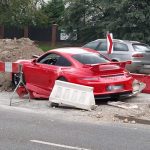 Czerwone porsche przebiło plastikowe bariery robót drogowych i wbiło się w górę piachu i gruzu.