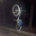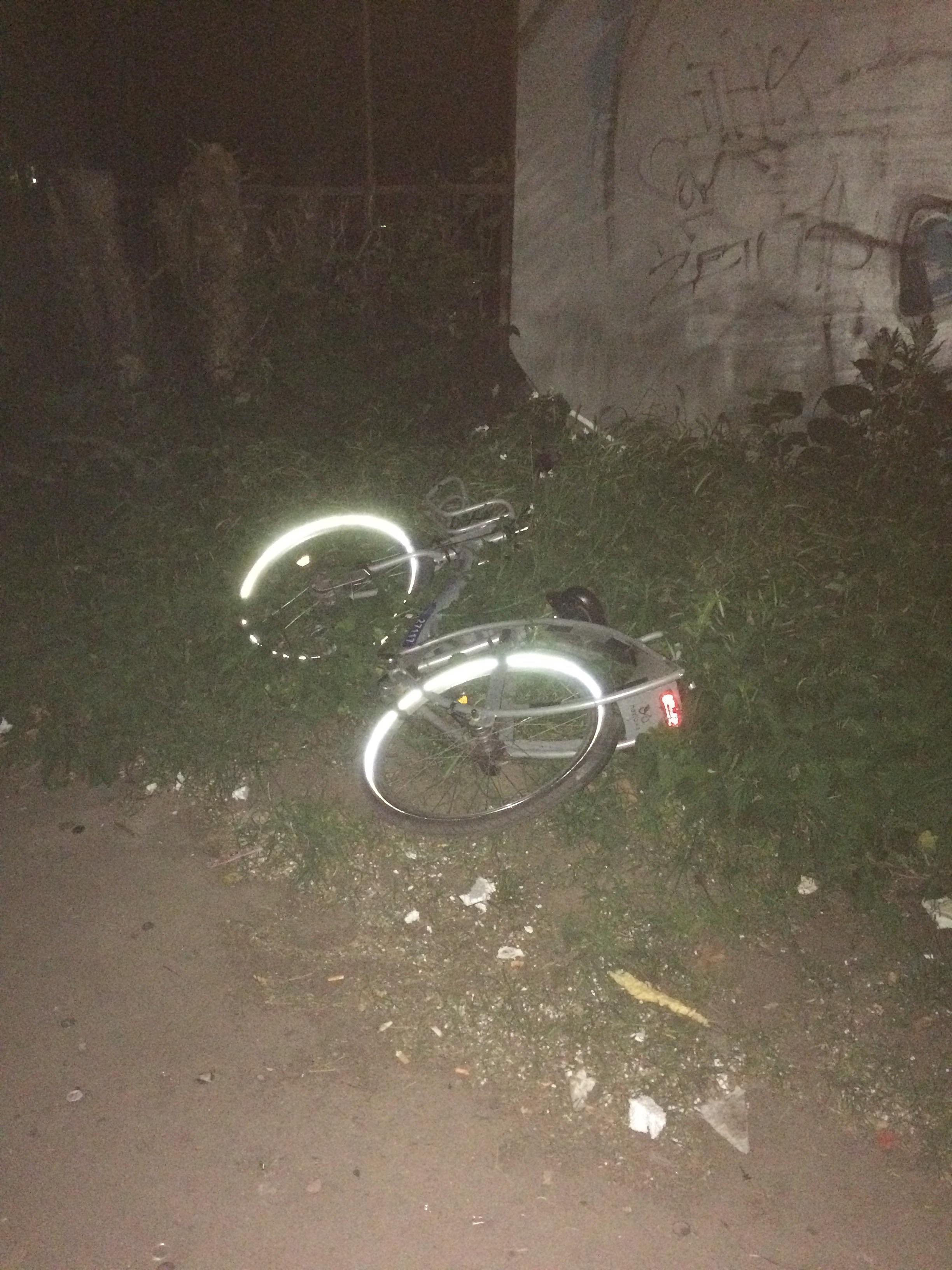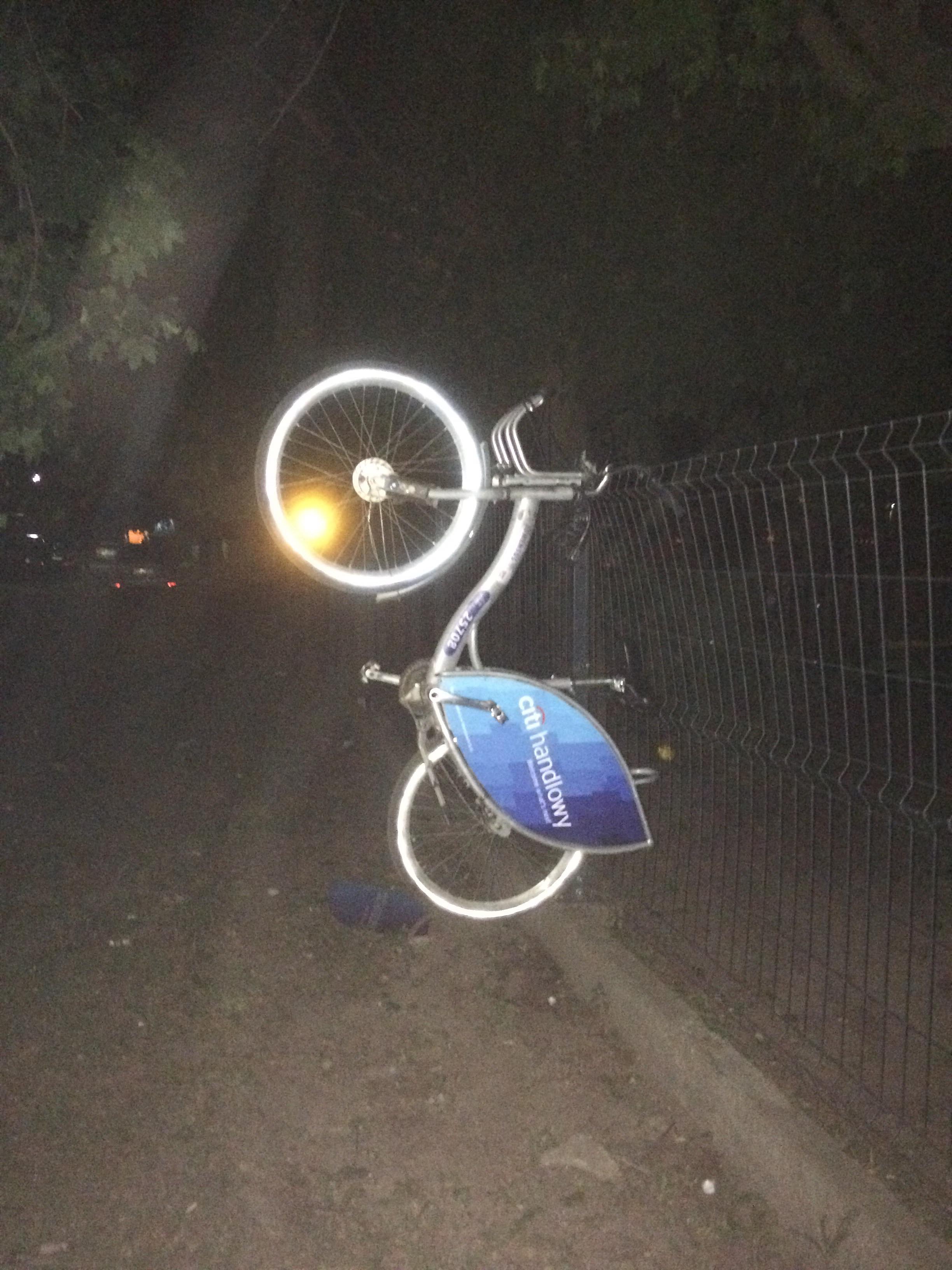 Jeden rower położony jest na ziemi, a drugi zawisł w powietrzu. Tak się przynajmniej wydawało w ciemnościach.