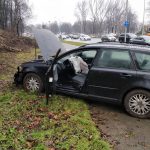 Poślizg, barierki, pas zieleni, drzewo i skarpa. Kierująca wyszła z auta i upadła na jezdnię