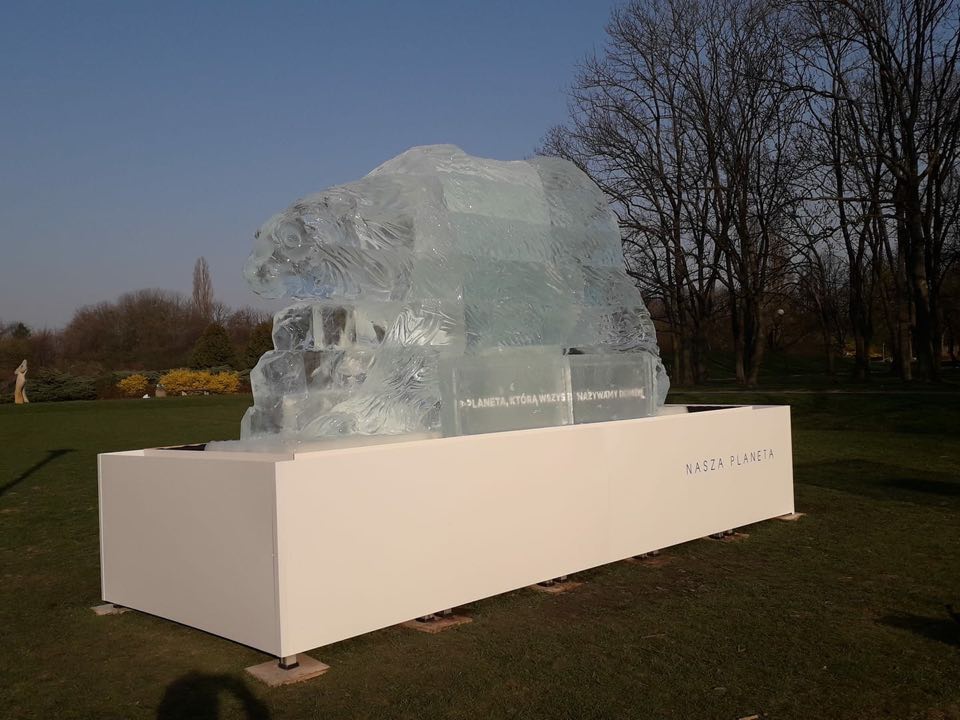 Na Polu Mokotowskim postawiono nietypową rzeźbę z lodu przedstawiającą niedźwiedzia polarnego. Jak nietrudno się domyślić, rzeźba przy tej temperaturze zwyczajnie się topi.
