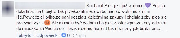 „Kochani! Pies jest już w domu. Policja dotarła aż na 6 piętro. (policjanci – przyp. redakcja) Powiedzieli tylko, że pani poszła z dziećmi na zakupy i chciała,żeby pies się przewietrzył… Ale musiała być w domu bo pies został wpuszczony od razu do mieszkania. Wiecie co….brak rozumu nie jest tak straszny jak brak serca……” – pisze znajoma z fundacji, która ma informacje co do psa.